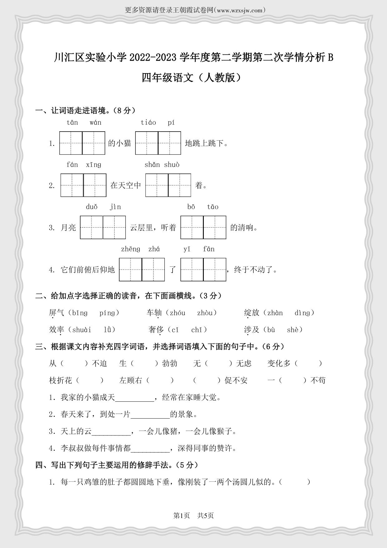 河南省周口市川汇区实验小学2022-2023学年第二学期四年级语文第二次学情分析B(人教版)