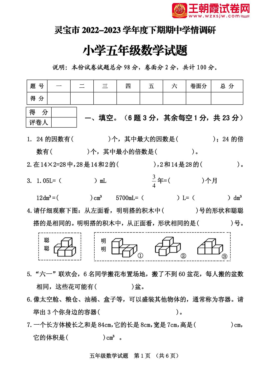 河南省三门峡市灵宝市2022—2023学年下学期期中学情调研试题五年级数学(人教版)