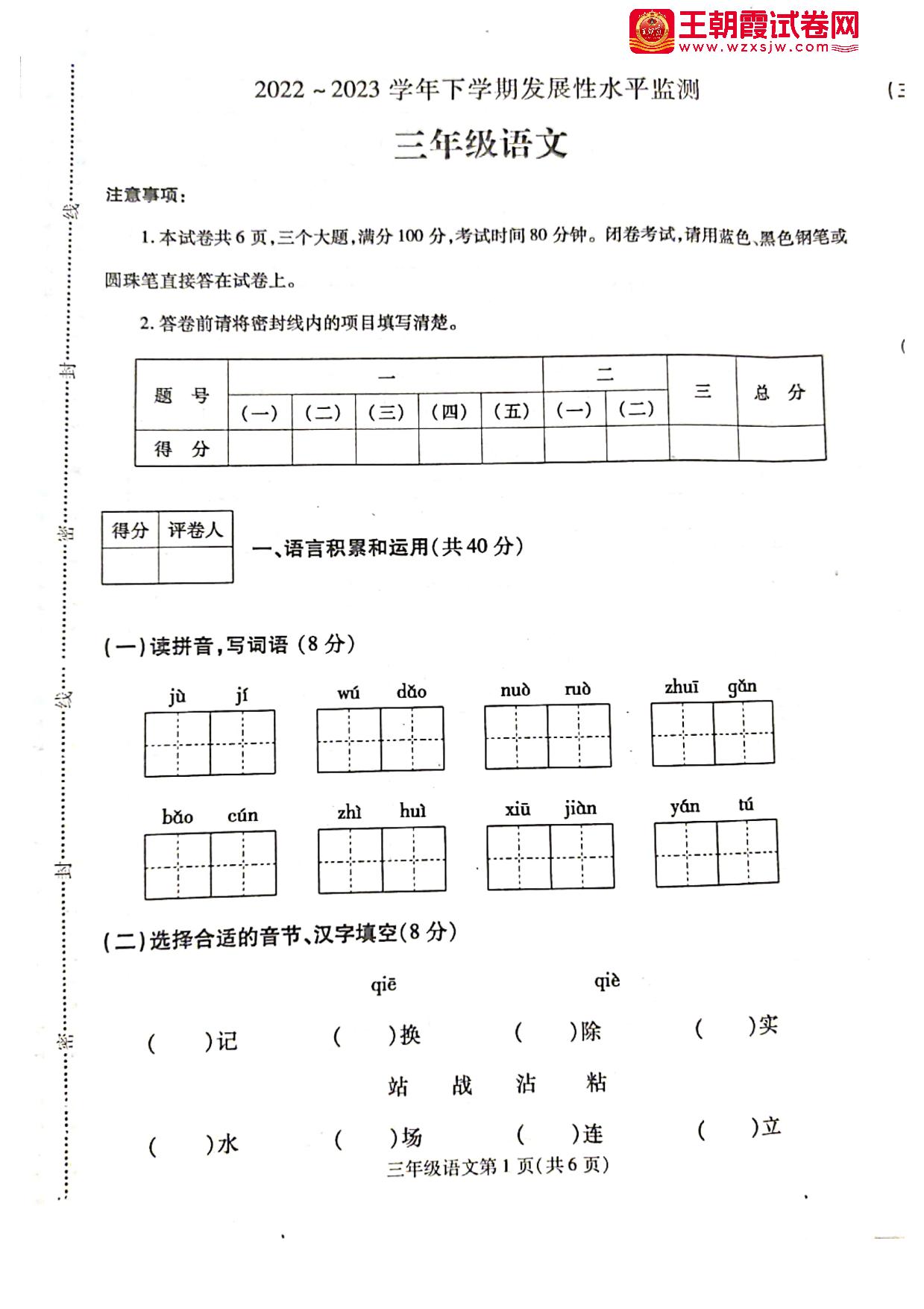 河南省漯河市舞阳县2022—2023学年下学期发展性水平监测试题三年级语文(人教版)