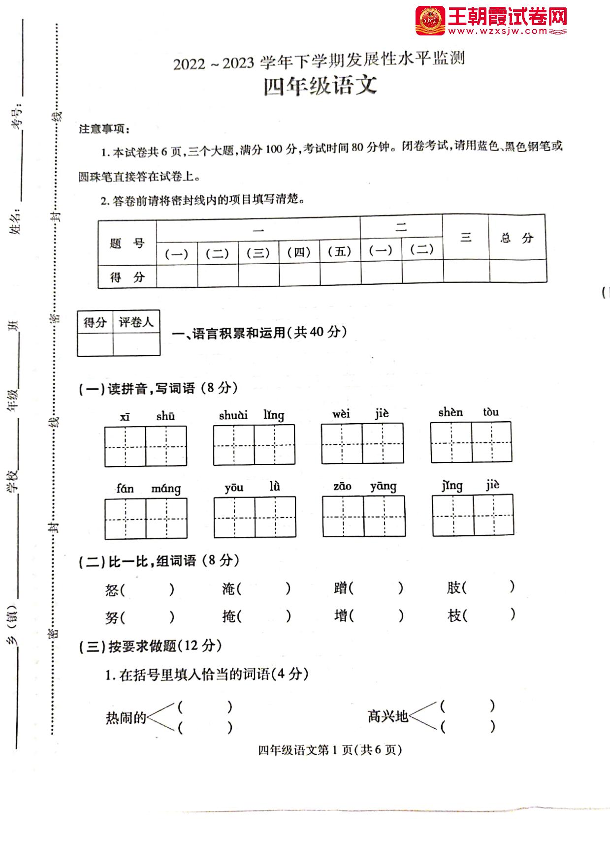 河南省漯河市舞阳县2022—2023学年下学期发展性水平监测试题四年级语文(人教版)