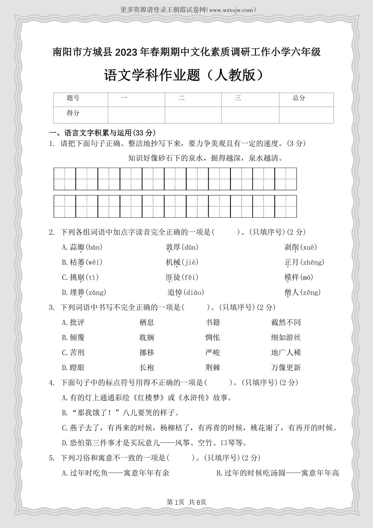 河南省南阳市方城县2022—2023学年第二学期期中试卷六年级语文(人教版)
