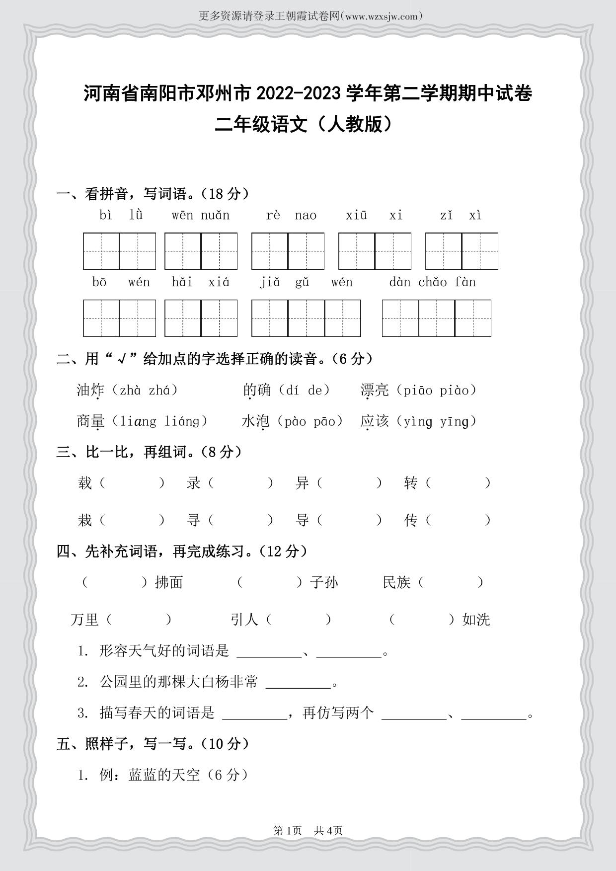 河南省南阳市邓州市2022—2023学年第二学期期中试卷二年级语文(人教版)