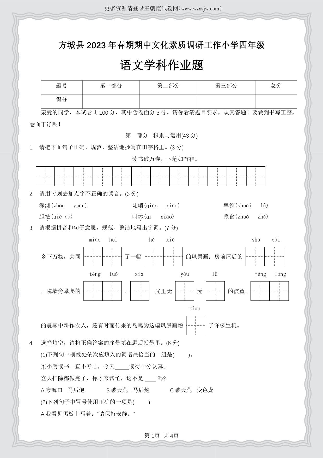 河南省南阳市方城县2022—2023学年第二学期期中试卷四年级语文(人教版)