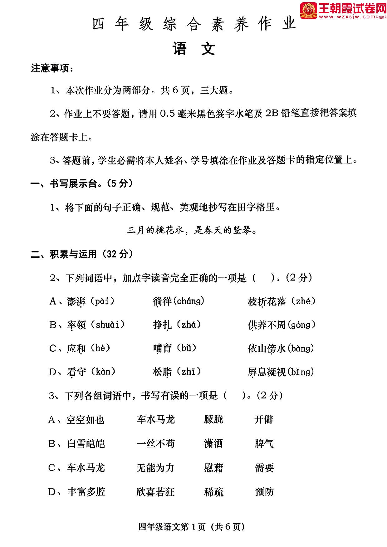 河南省南阳市社旗县2022—2023学年第二学期期中综合素养作业四年级语文(人教版)