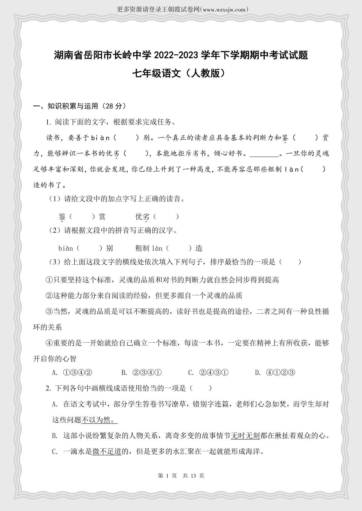 湖南省岳阳市长岭中学2022-2023学年下学期期中考试试题七年级语文(人教版)