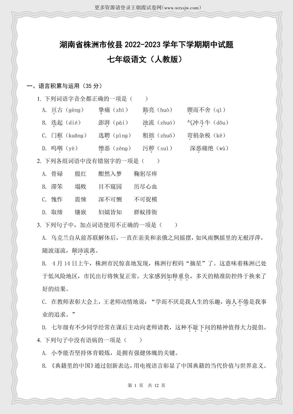 湖南省株洲市攸县2022-2023学年下学期期中试题七年级语文(人教版)