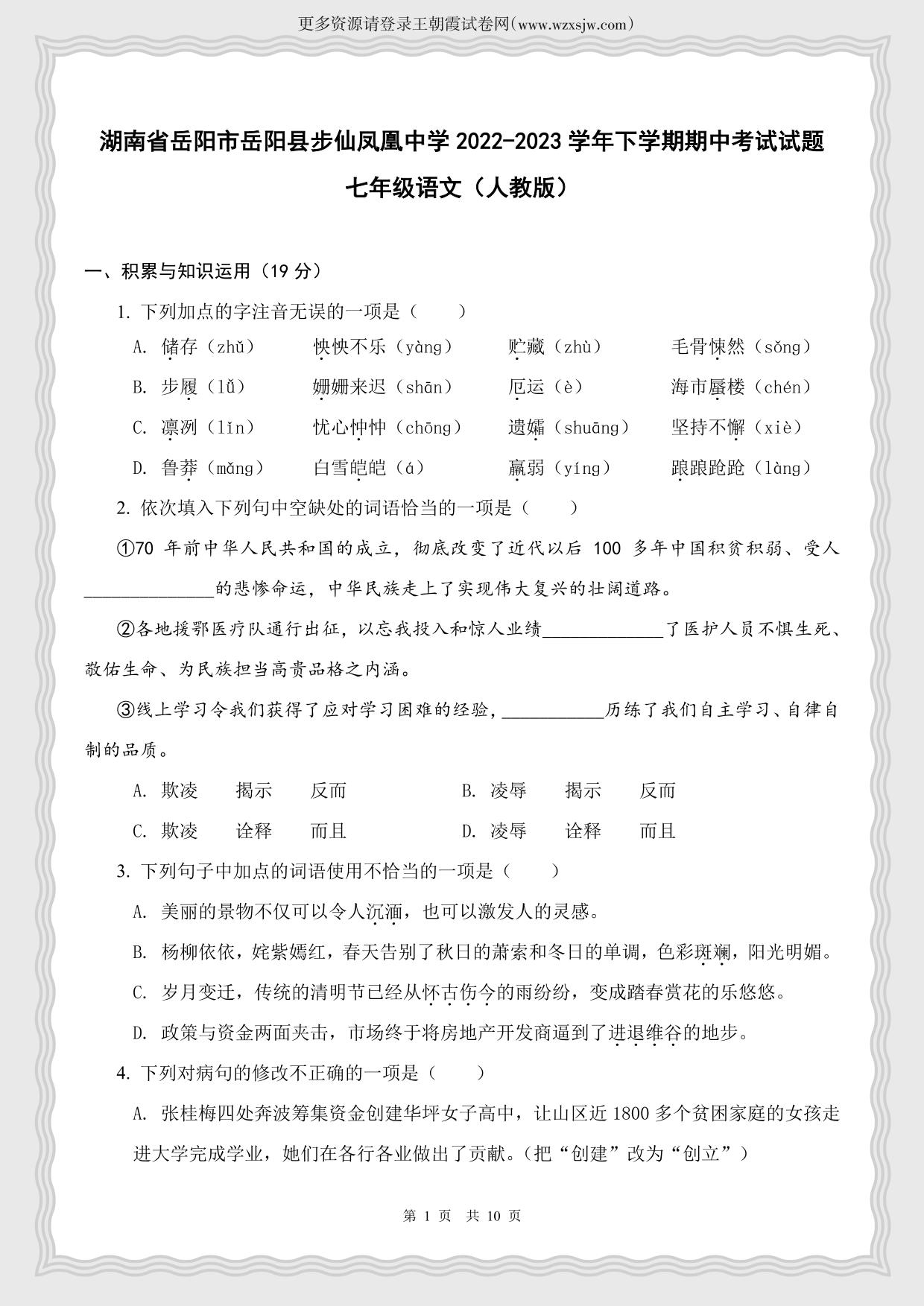 湖南省岳阳市岳阳县步仙凤凰中学2022-2023学年下学期期中考试试题七年级语文(人教版)