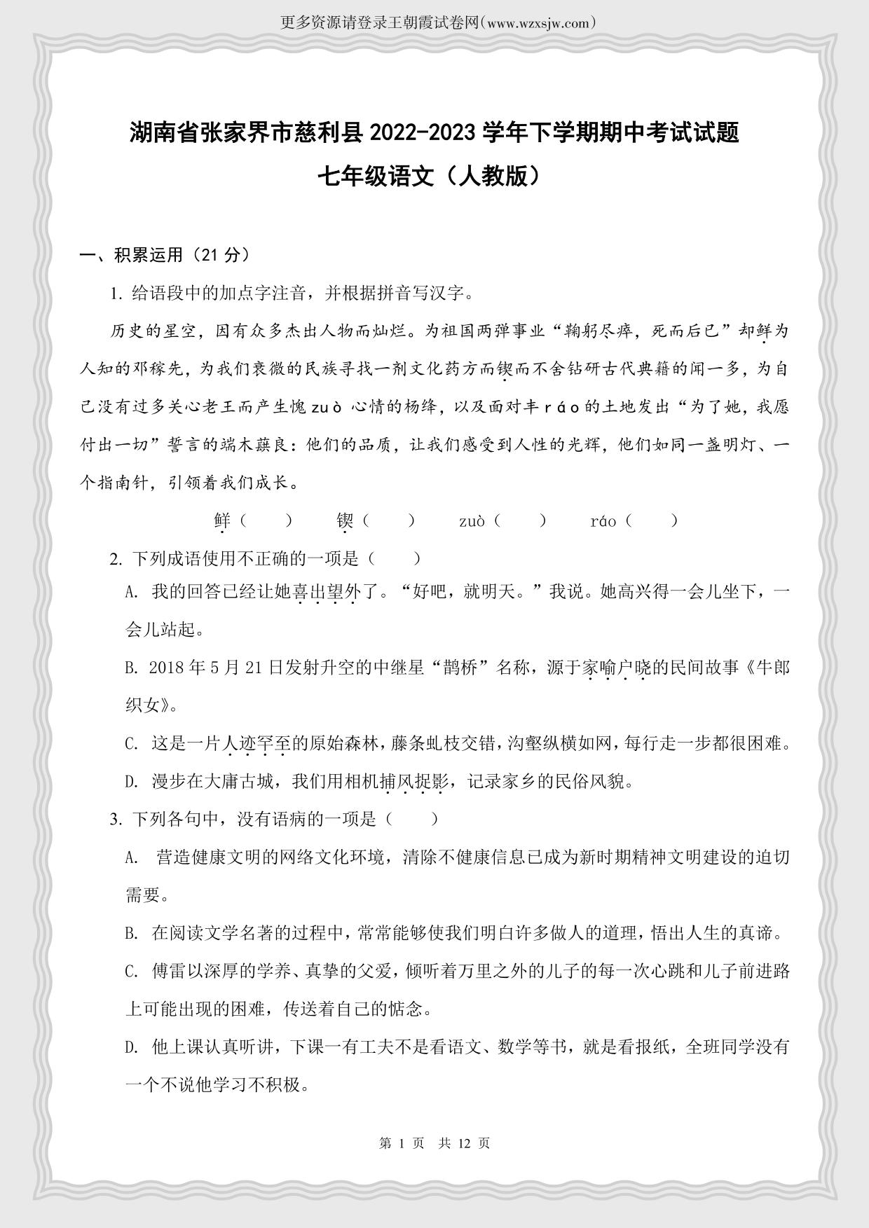 湖南省张家界市慈利县2022-2023学年下学期期中考试试题七年级语文(人教版)
