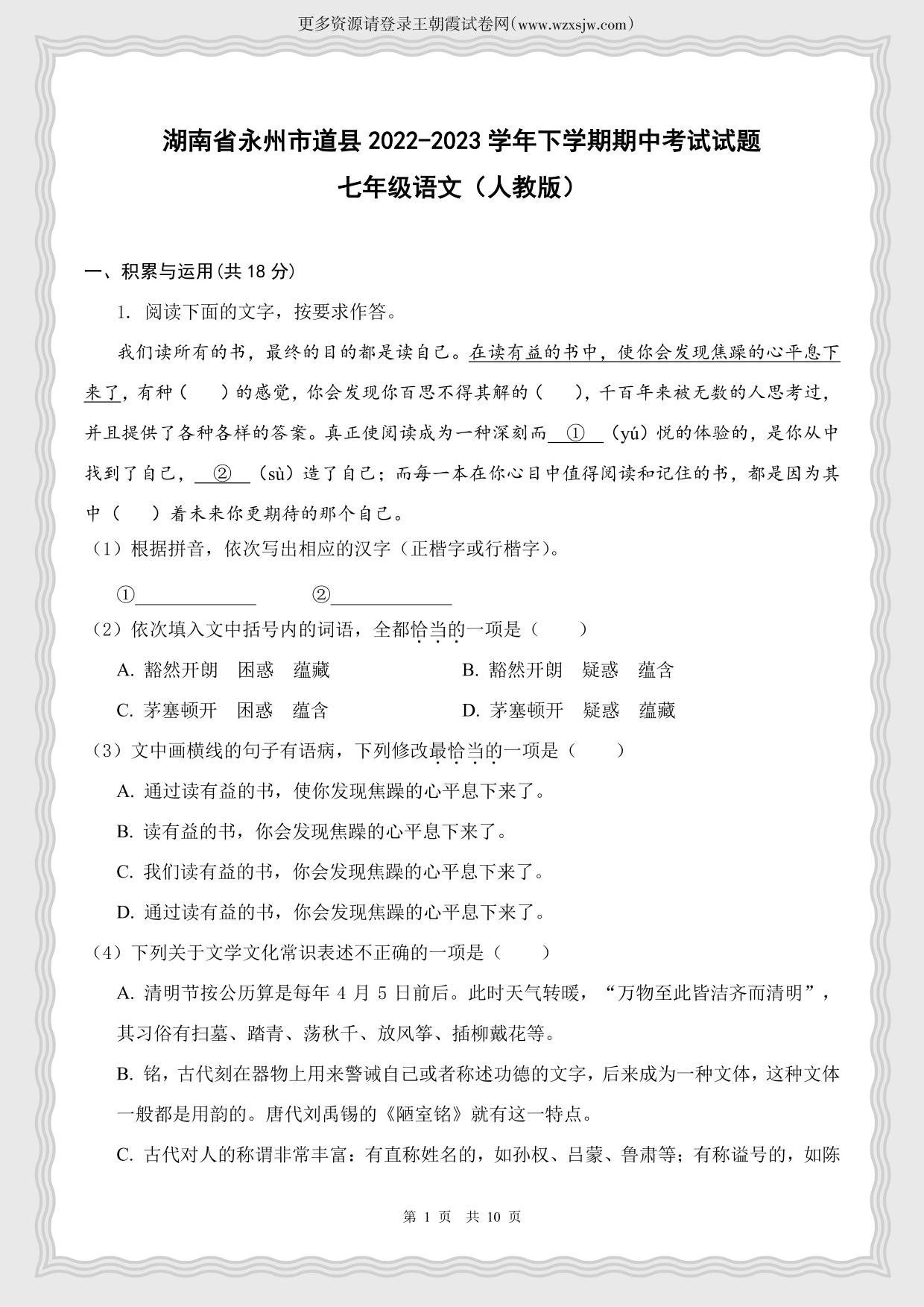 湖南省永州市道县2022-2023学年下学期期中考试试题七年级语文(人教版)