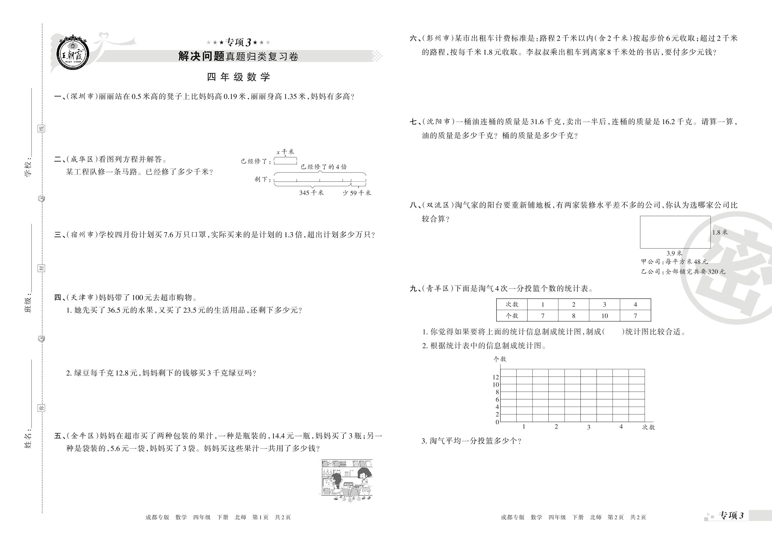 王朝霞期末专项卷——解决问题真题归类复习、新颖题速递:生活与数学四年级下册数学(北师版)_R210804134147【0】