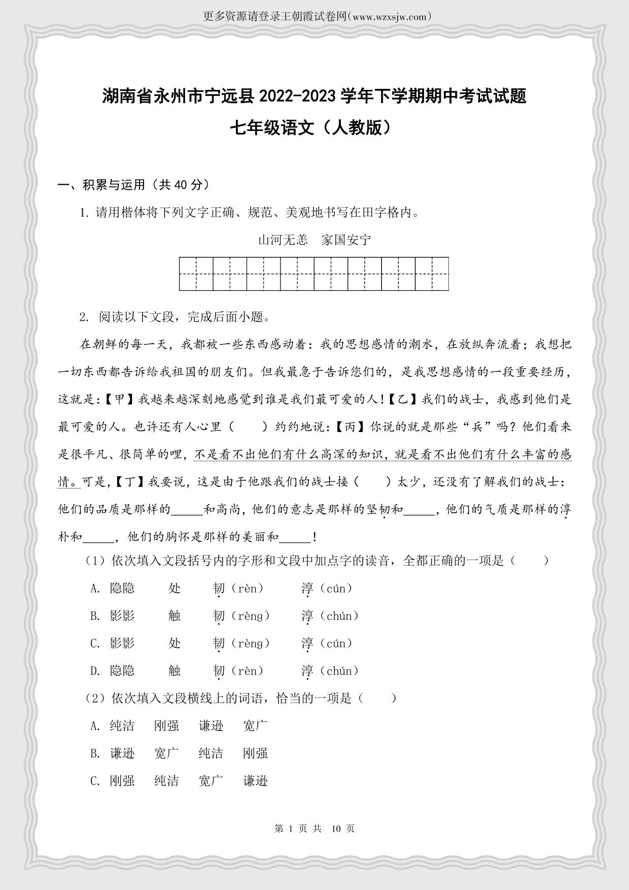 湖南省永州市宁远县2022-2023学年下学期期中考试试题七年级语文(人教版)