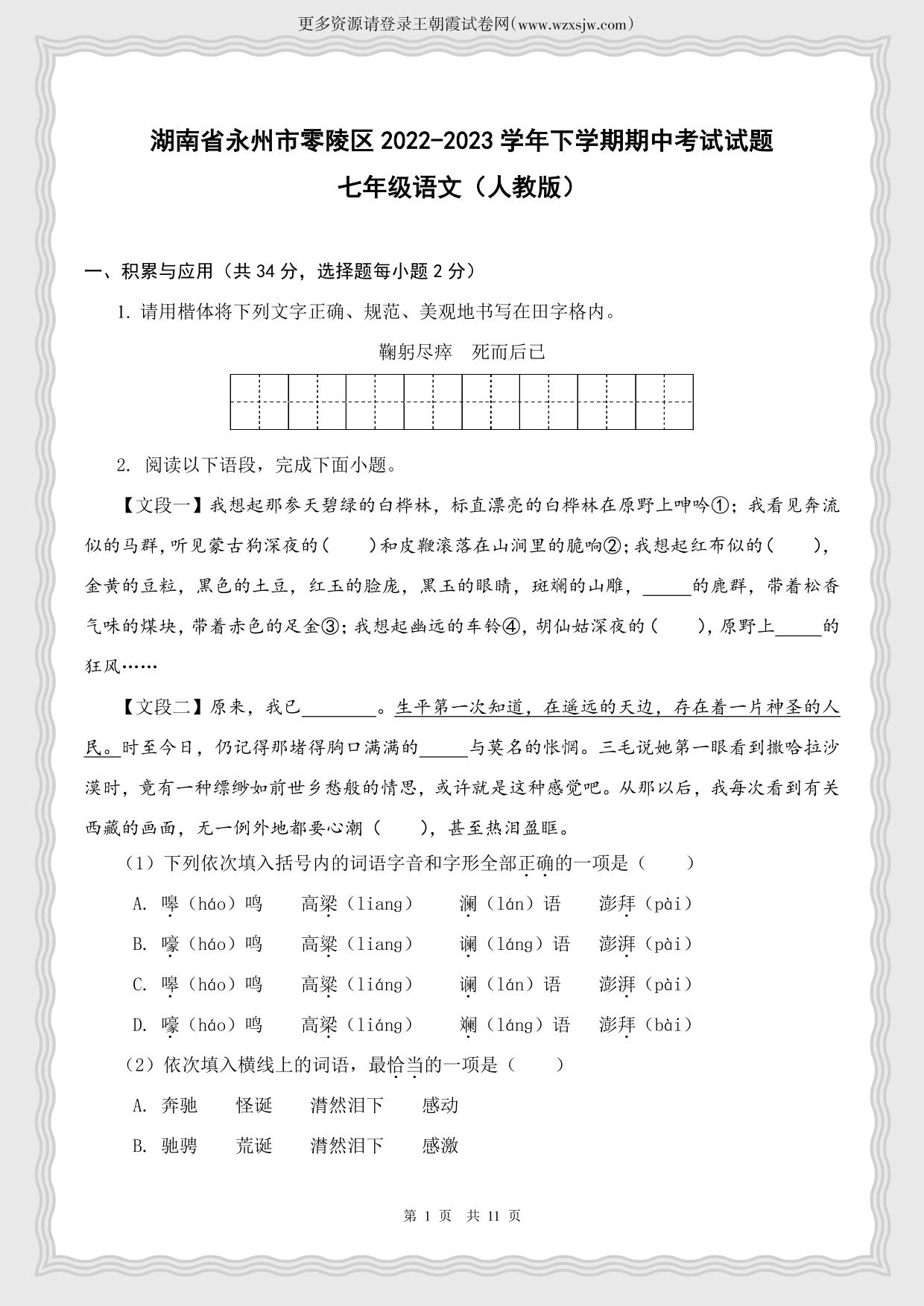 湖南省永州市零陵区2022-2023学年下学期期中考试试题七年级语文(人教版)