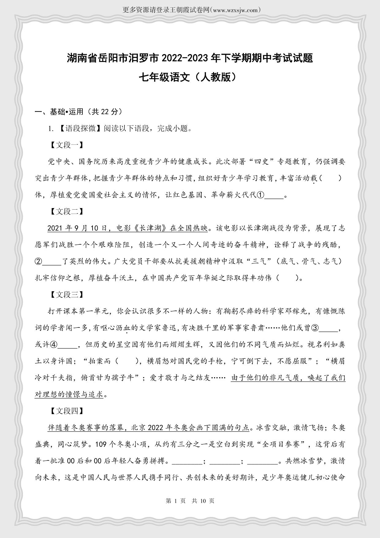 湖南省岳阳市汨罗市2022-2023年下学期期中考试试题七年级语文(人教版)