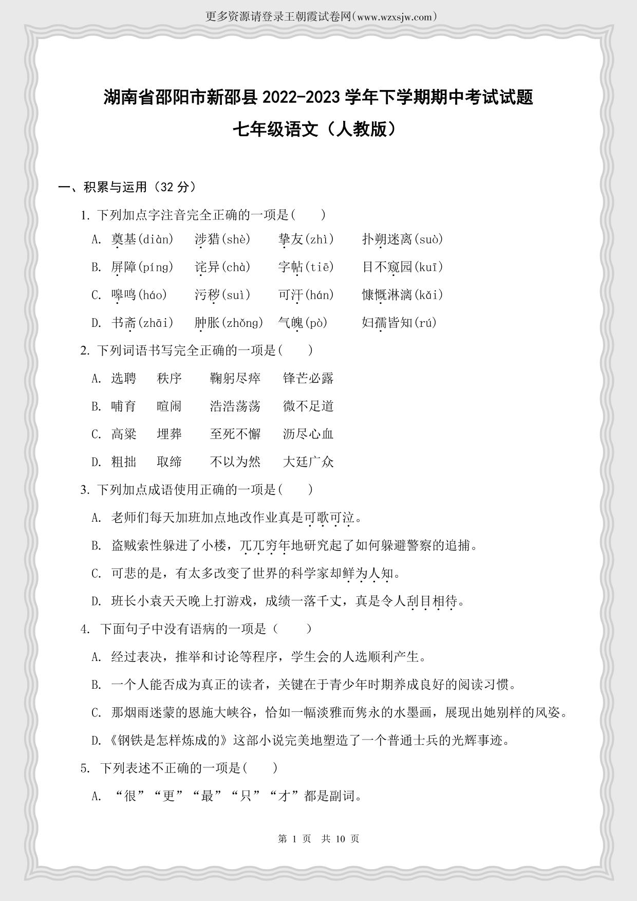 湖南省邵阳市新邵县2022-2023学年下学期期中考试试题七年级语文(人教版)