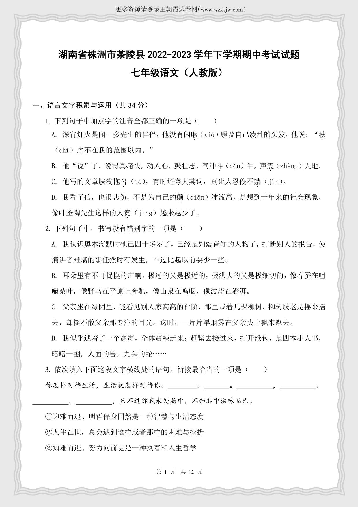湖南省株洲市茶陵县2022-2023学年下学期期中考试试题七年级语文(人教版)
