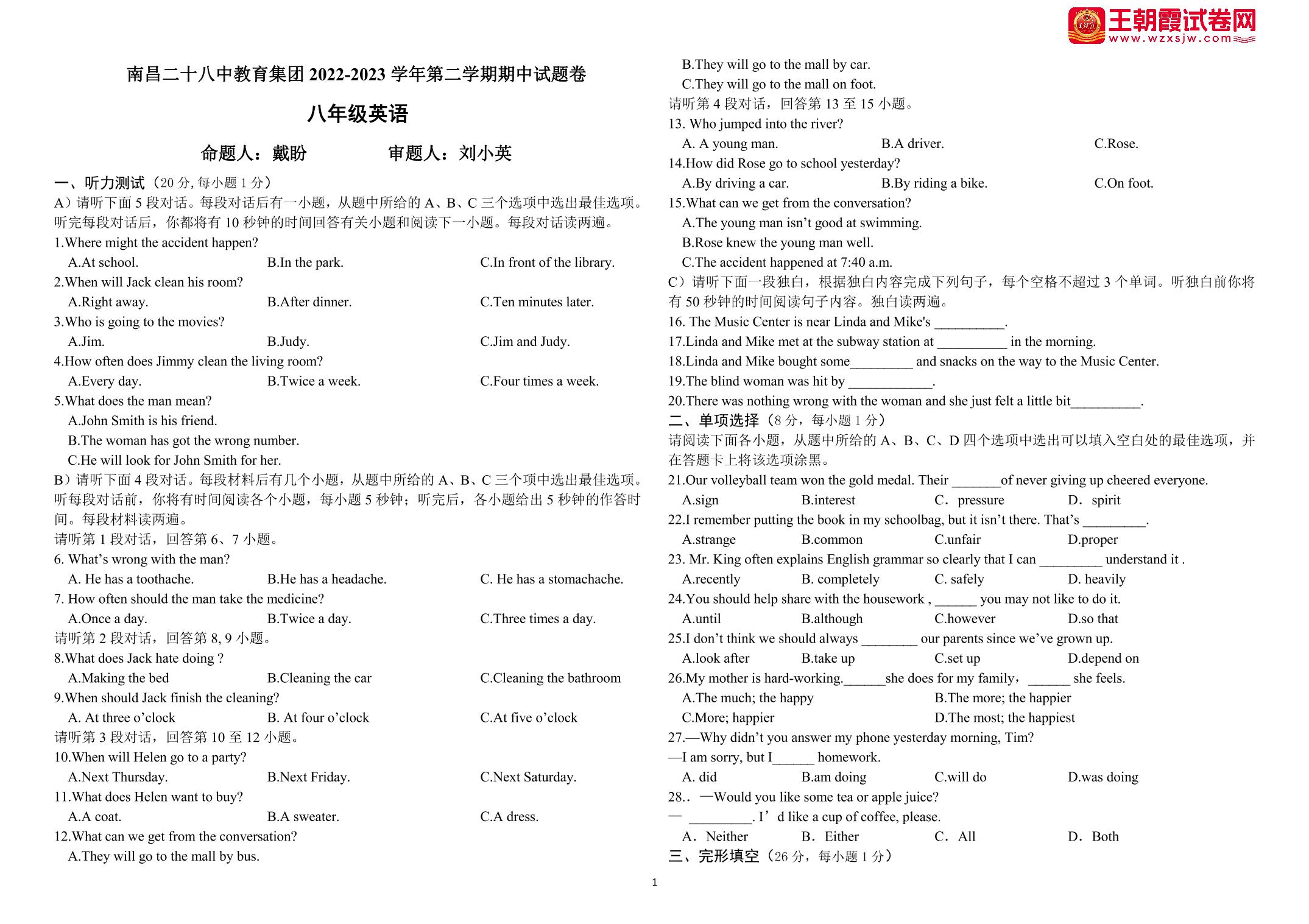 江西省南昌市二十八中教育集团 2022--2023 学年第二学期期中试题卷八年级英语(人教版)