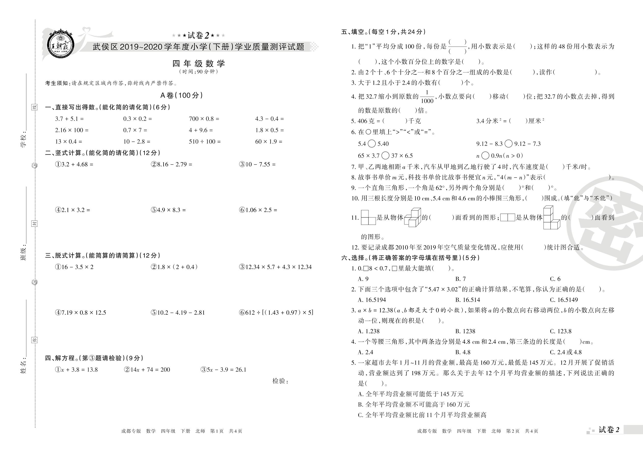 2019-2020学年第二学期成都市武侯区四年级数学试卷(北师版)【2】