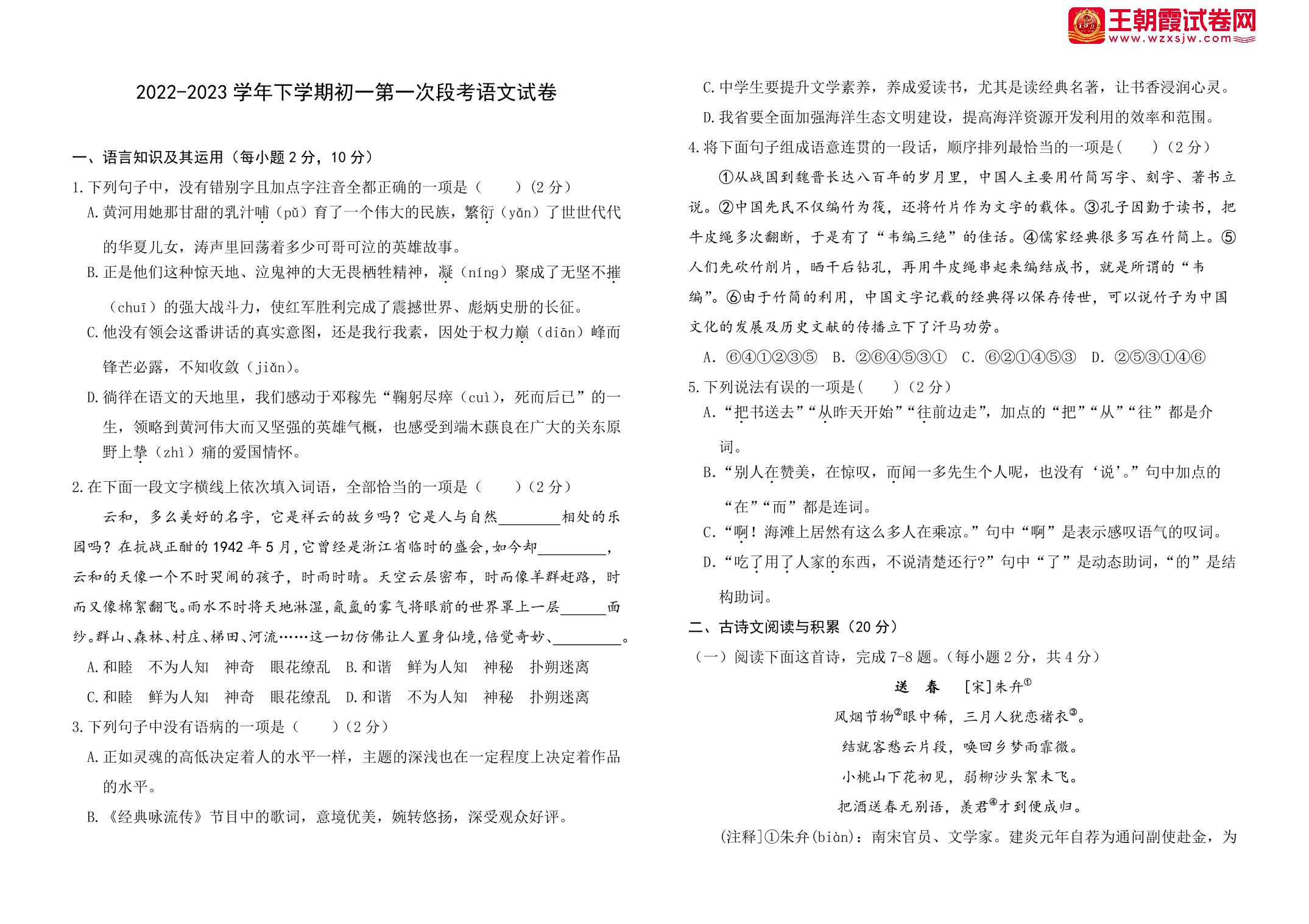 七年级语文人教版下册月考卷