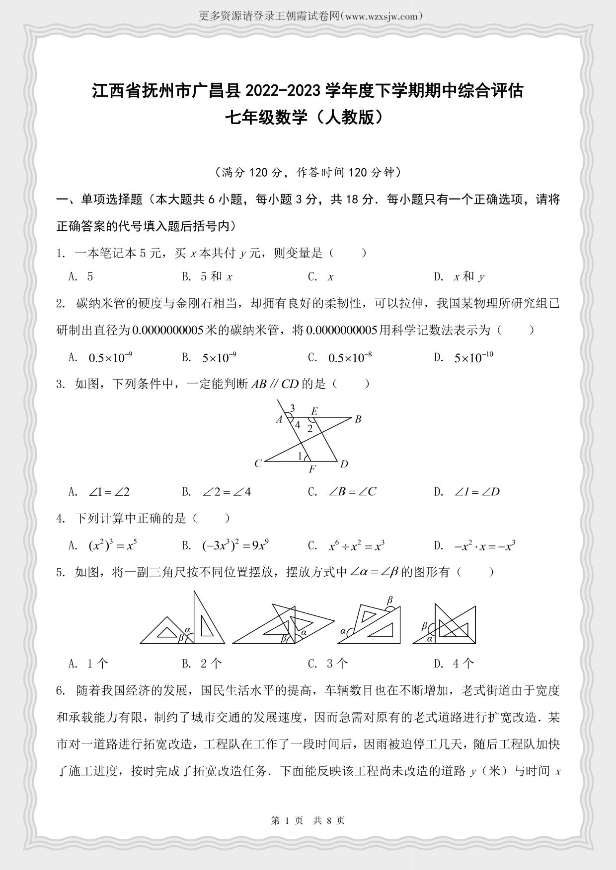 江西省抚州市广昌县2022-2023学年度下学期期中综合评估七年级数学(人教版)