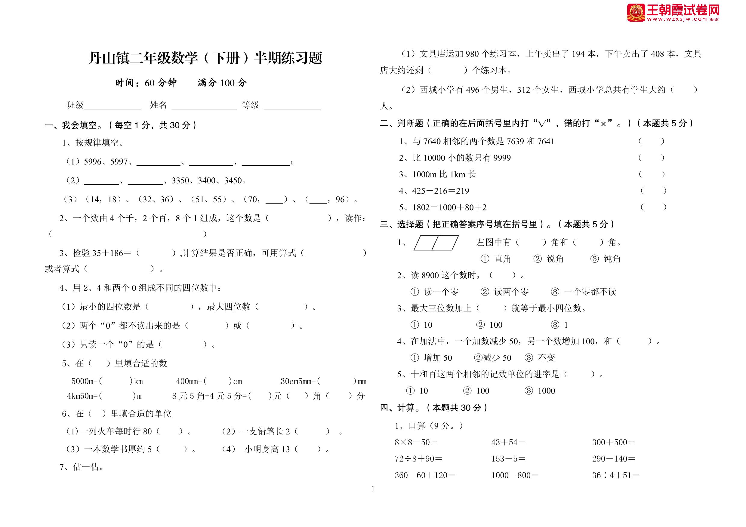四川省资阳市雁江区丹山镇2022-2023学年度下学期期中练习二年级数学(西师版)