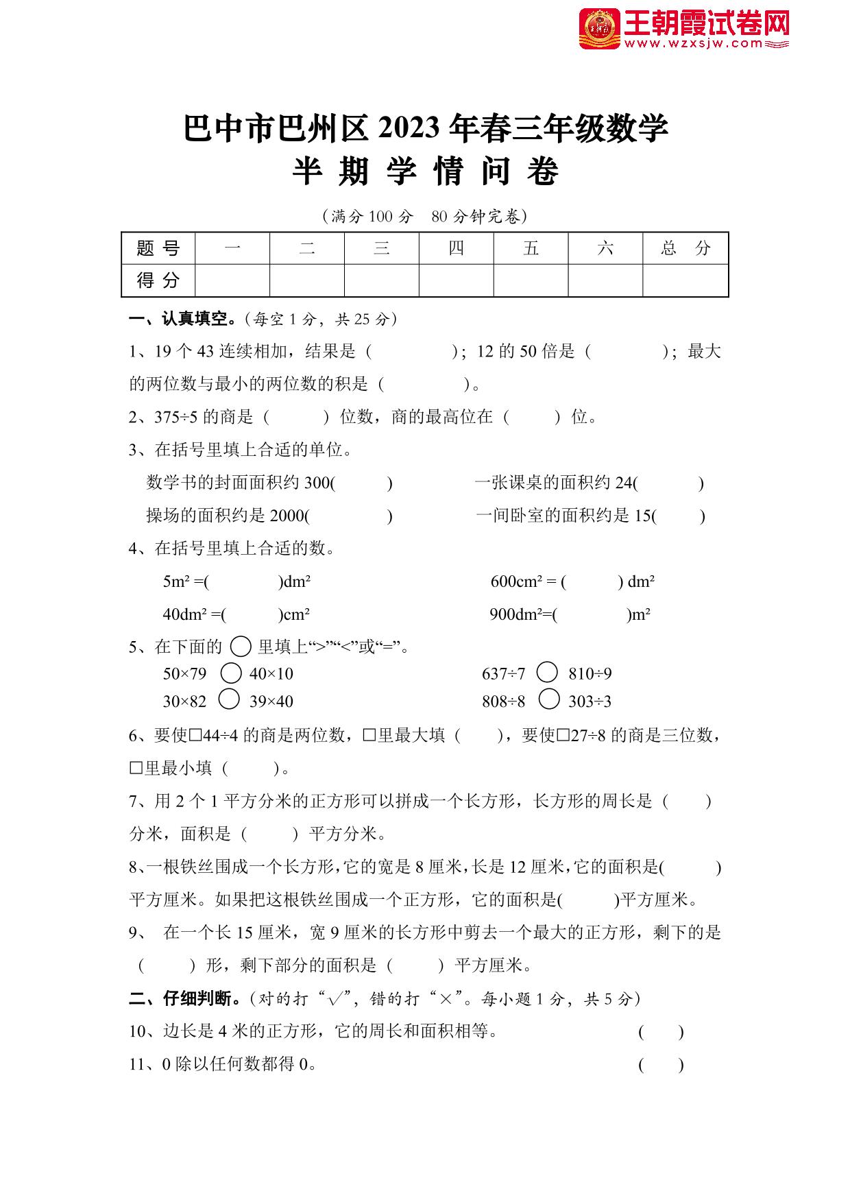 四川省巴中市巴州区2022-2023学年下学期期中学情问卷三年级数学(西师版)