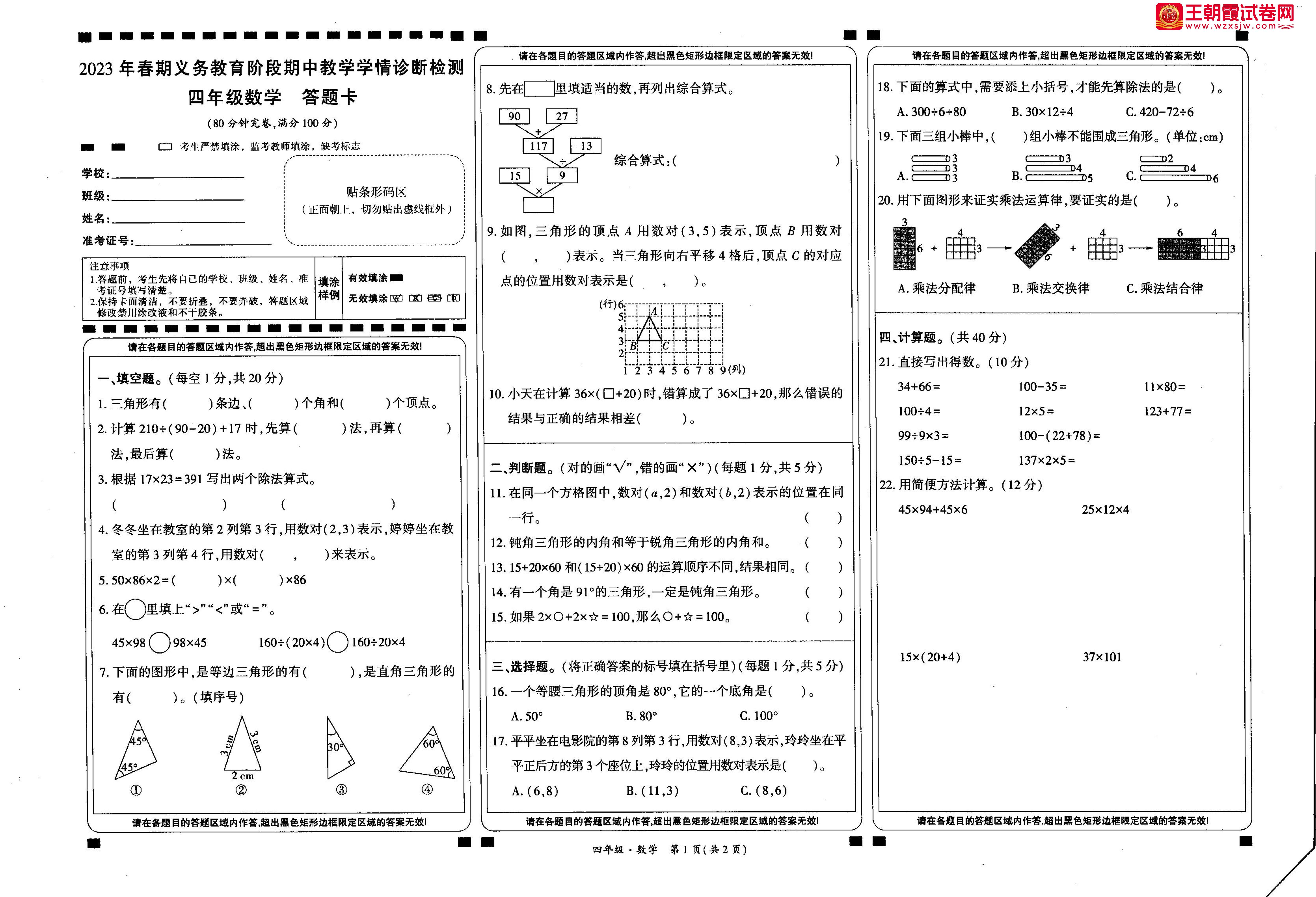 四川省宜宾市兴文县2022-2023学年下学期期中学情诊断检测四年级数学(西师版)