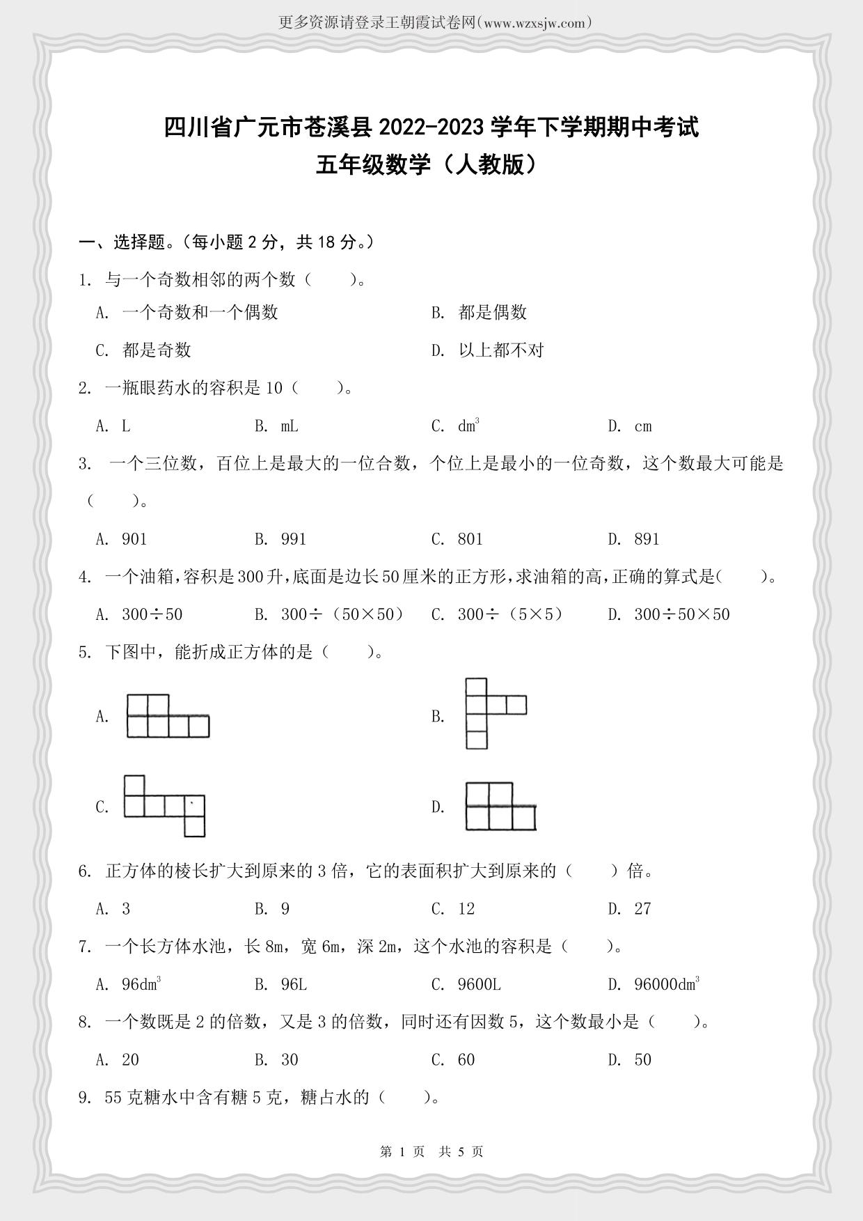 四川省广元市苍溪县2022-2023学年下学期期中考试五年级数学(人教版)