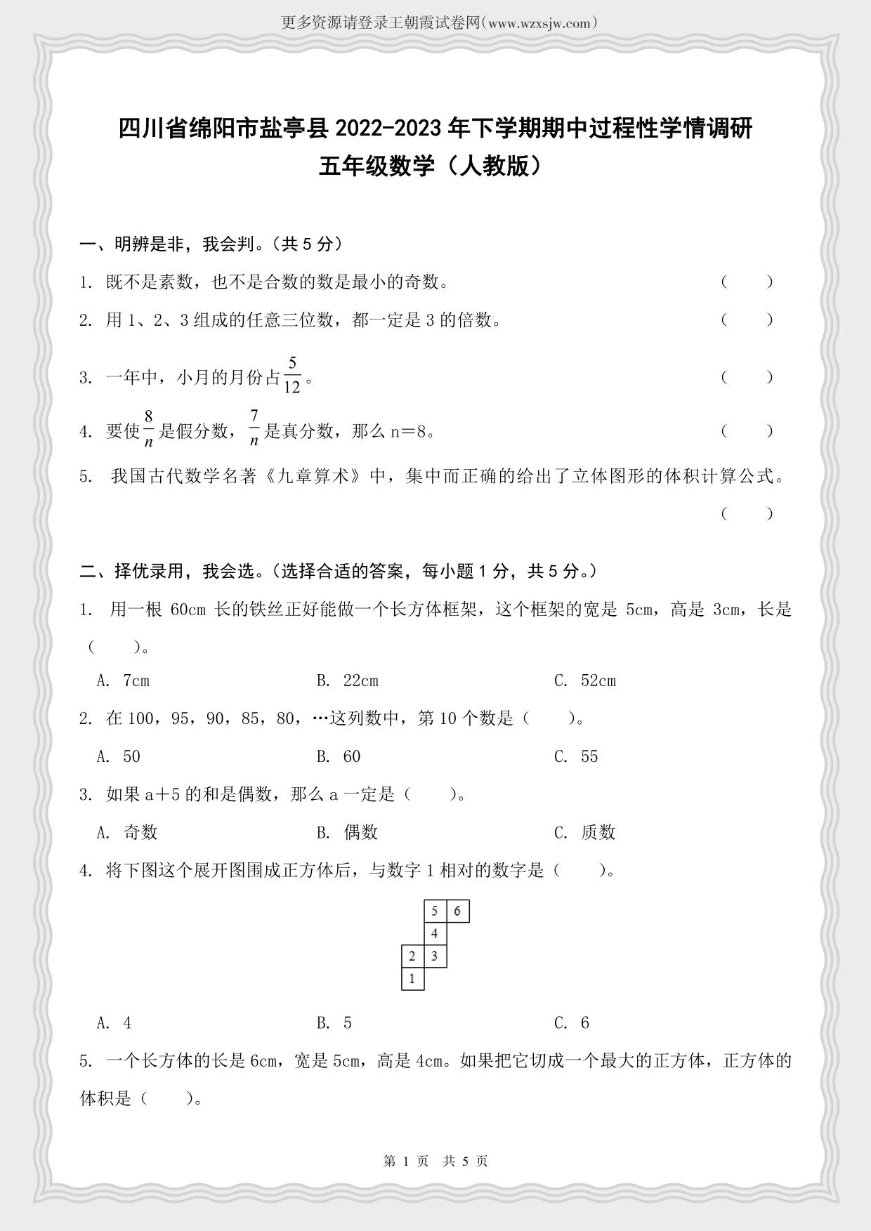 四川省绵阳市盐亭县2022-2023学年下学期期中过程性学情调研五年级数学(人教版)