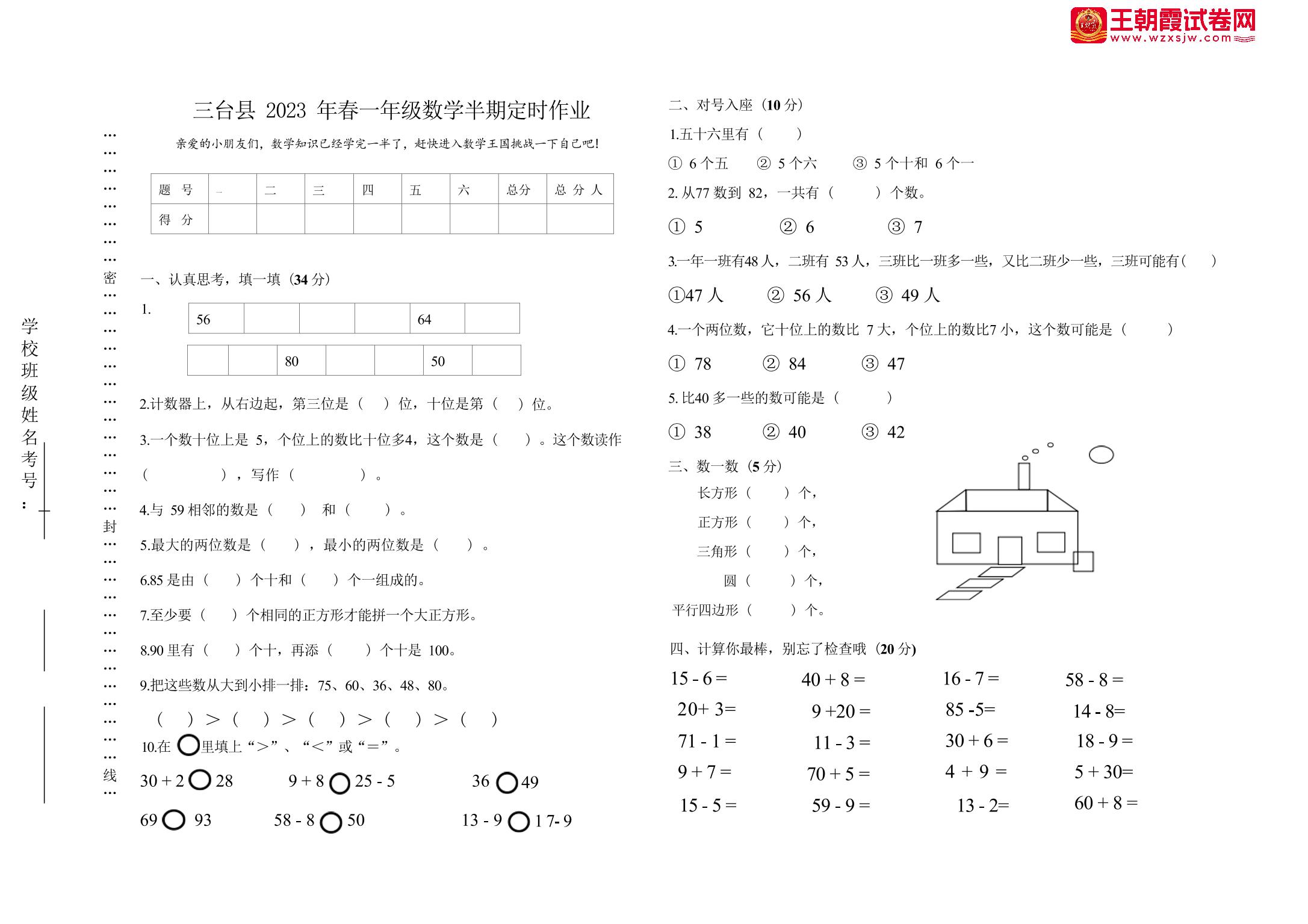 四川省绵阳市三台县2022-2023学年下学期期中定时作业一年级数学(人教版)