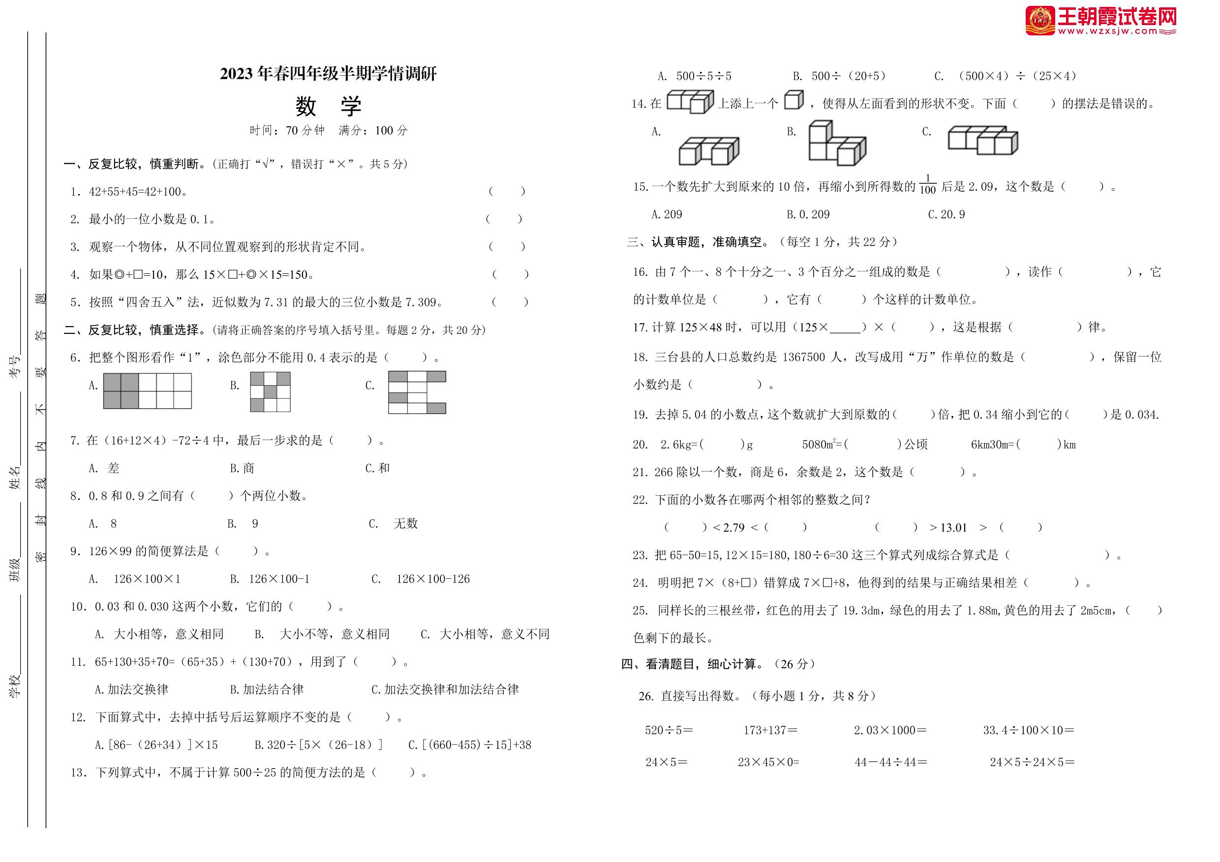四年级数学人教版下册期中卷