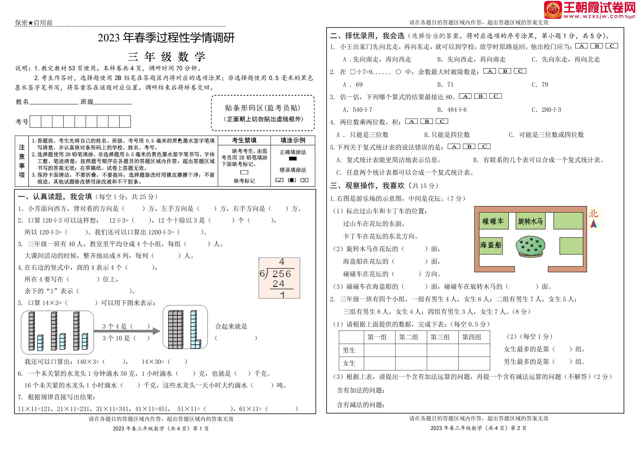 四川省绵阳市盐亭县2022-2023学年下学期期中过程性学情调研三年级数学(人教版)