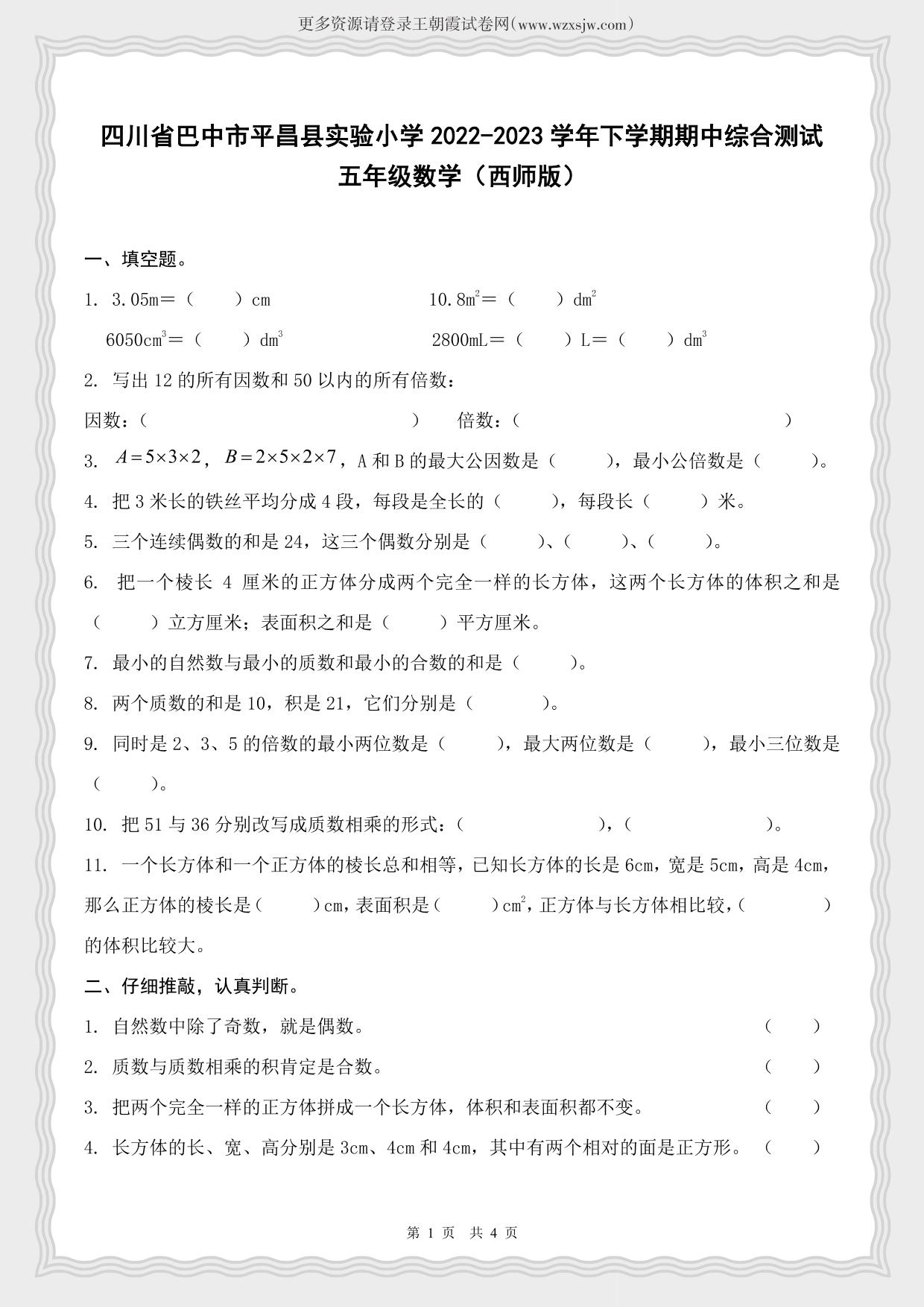 四川省巴中市平昌县实验小学2022-2023学年下学期期中综合测试五年级数学(西师版)