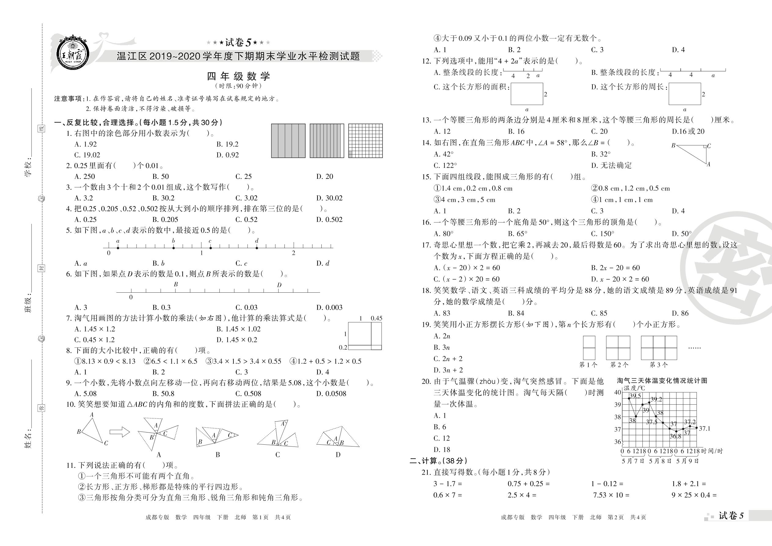 2019-2020学年第二学期成都市温江区四年级数学试卷(北师版)【5】