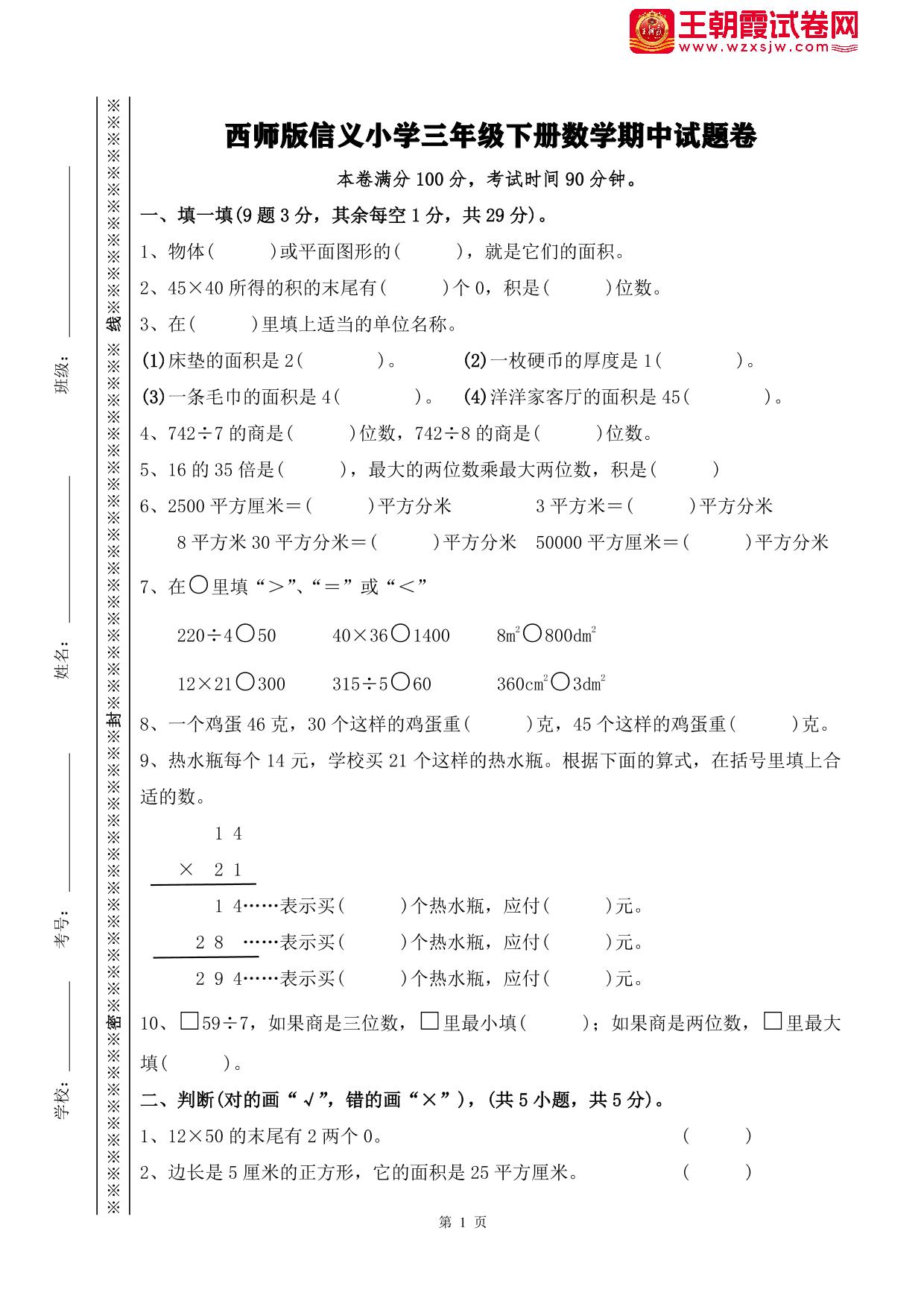 四川省巴中市平昌县信义小学2022-2023学年下学期期中试题三年级数学(西师版)