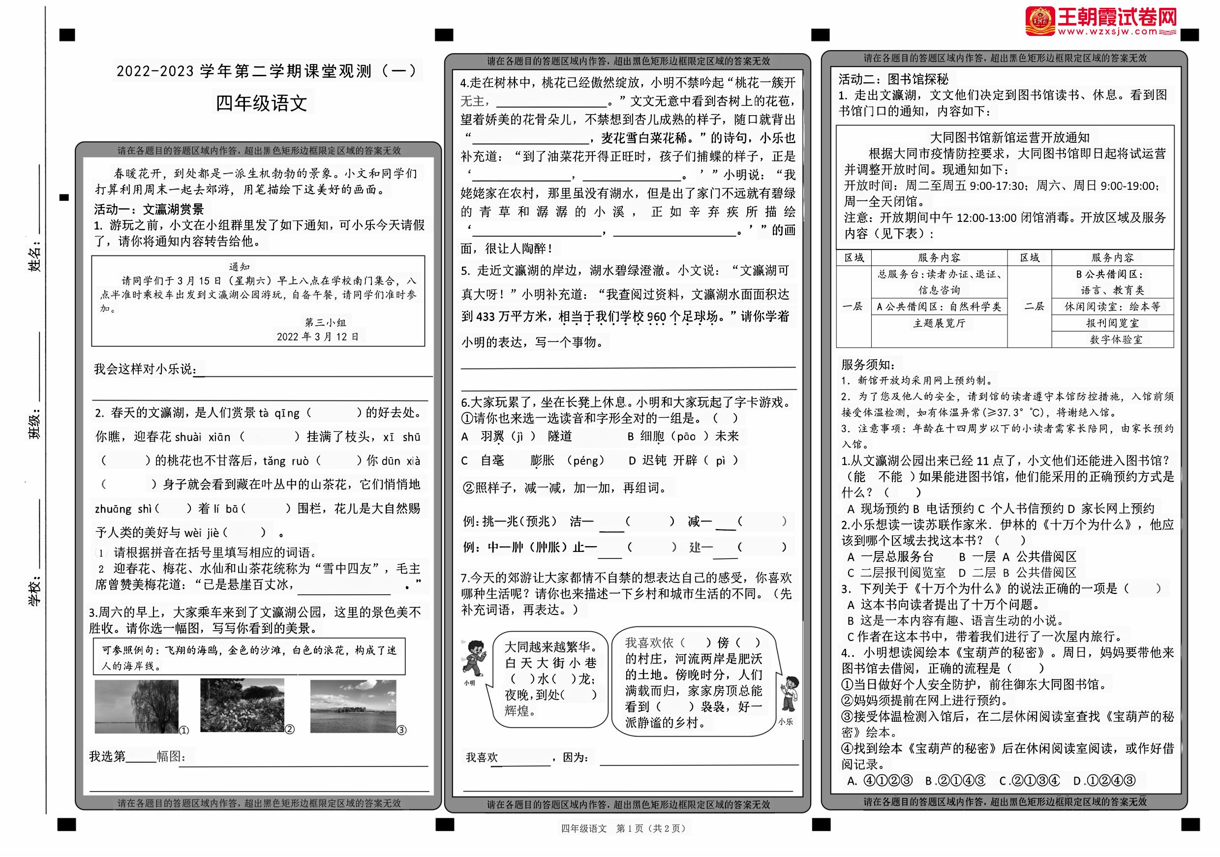 山西省大同市新荣区2022-2023学年第二学期课堂观测(3月月考)四年级语文(人教版)