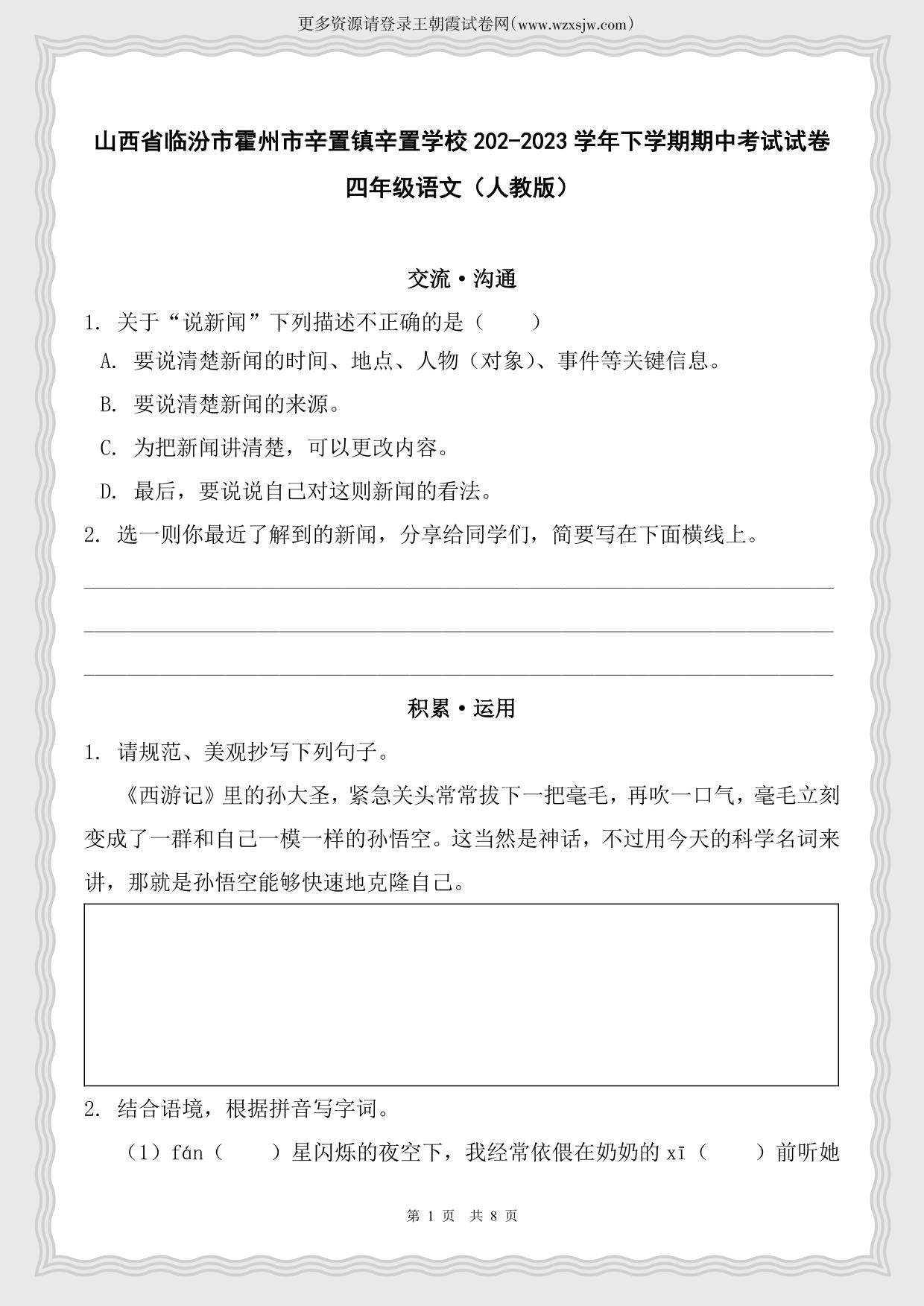山西省临汾市霍州市辛置镇辛置学校202-2023学年下学期期中考试试卷四年级语文(人教版)