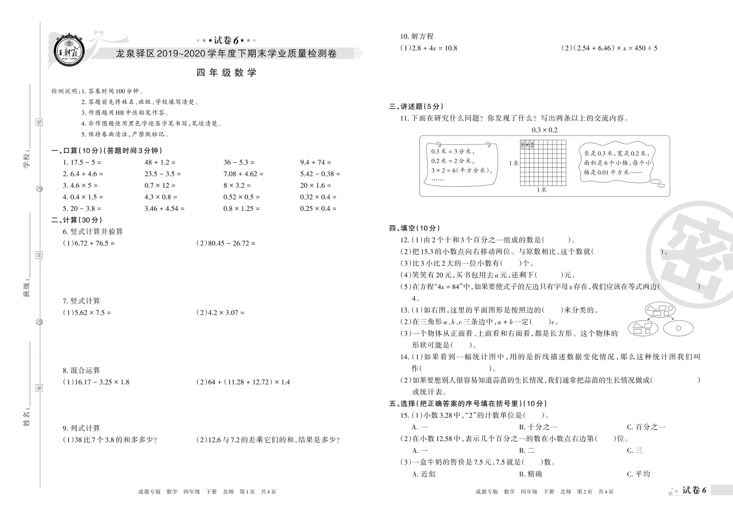 2019-2020学年第二学期成都市龙泉驿区四年级数学试卷(北师版)【6】