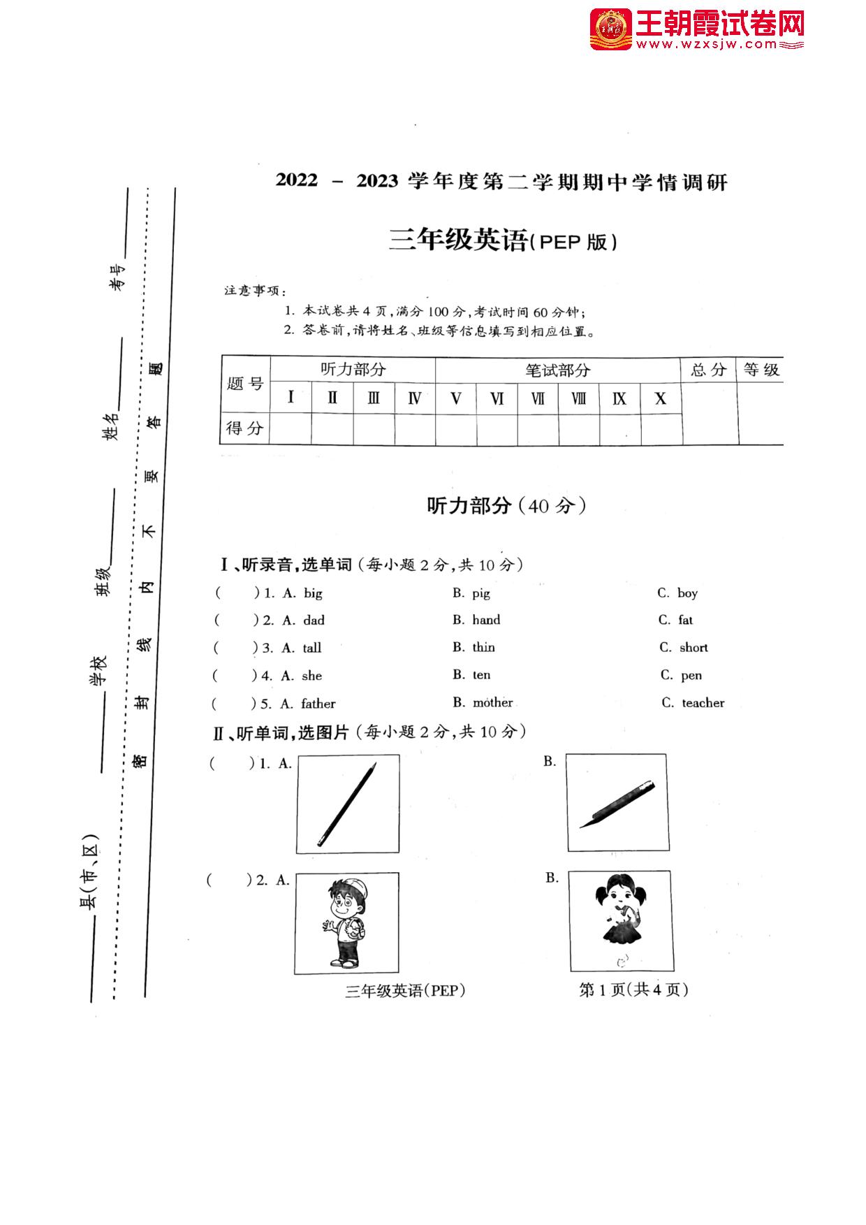 山西省忻州市繁峙县北城中学2022-2023学年度第二学期期中学情调研三年级英语(PEP版)【无听力音频】