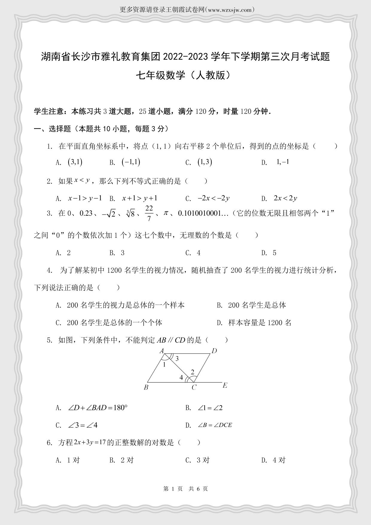 湖南省长沙市雅礼教育集团2022-2023学年下学期第三次月考试题七年级数学(人教版)