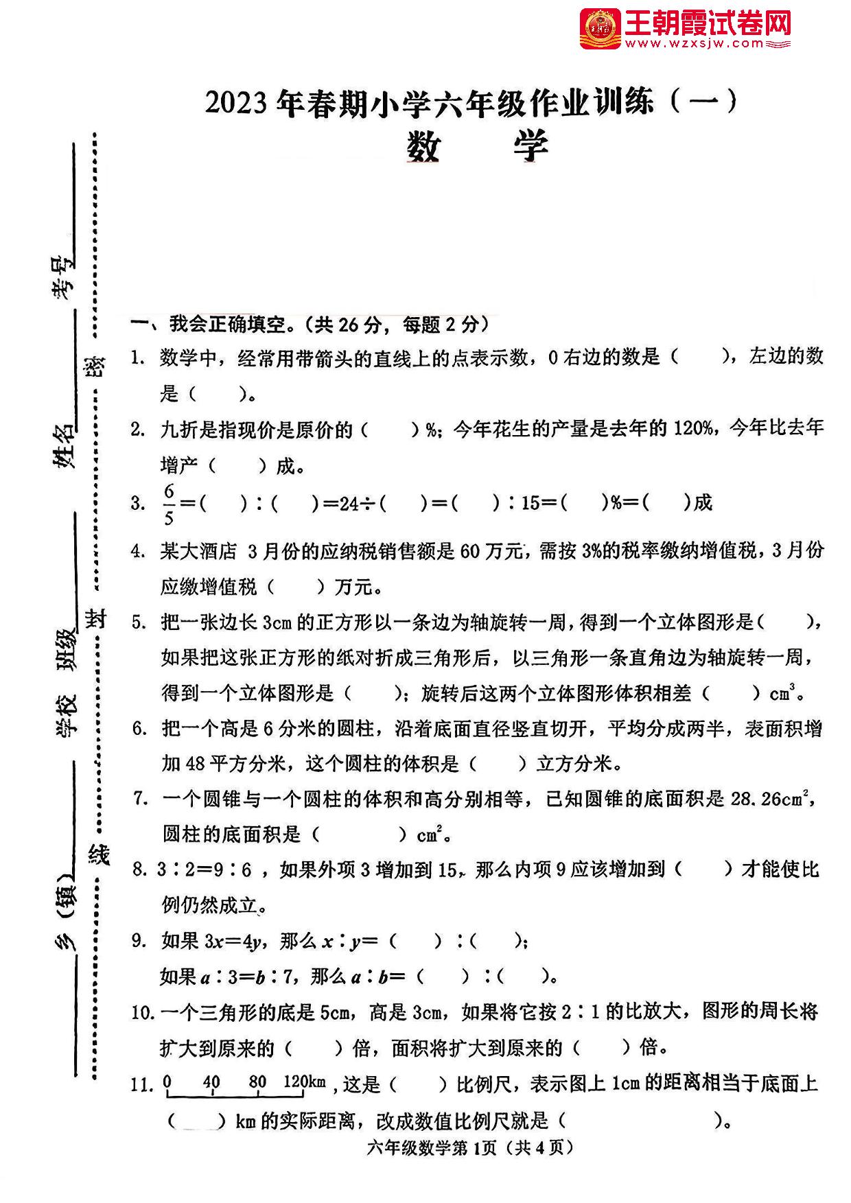 河南省南阳市新野县2022—2023学年下学期期中作业训练试题六年级数学(人教版)