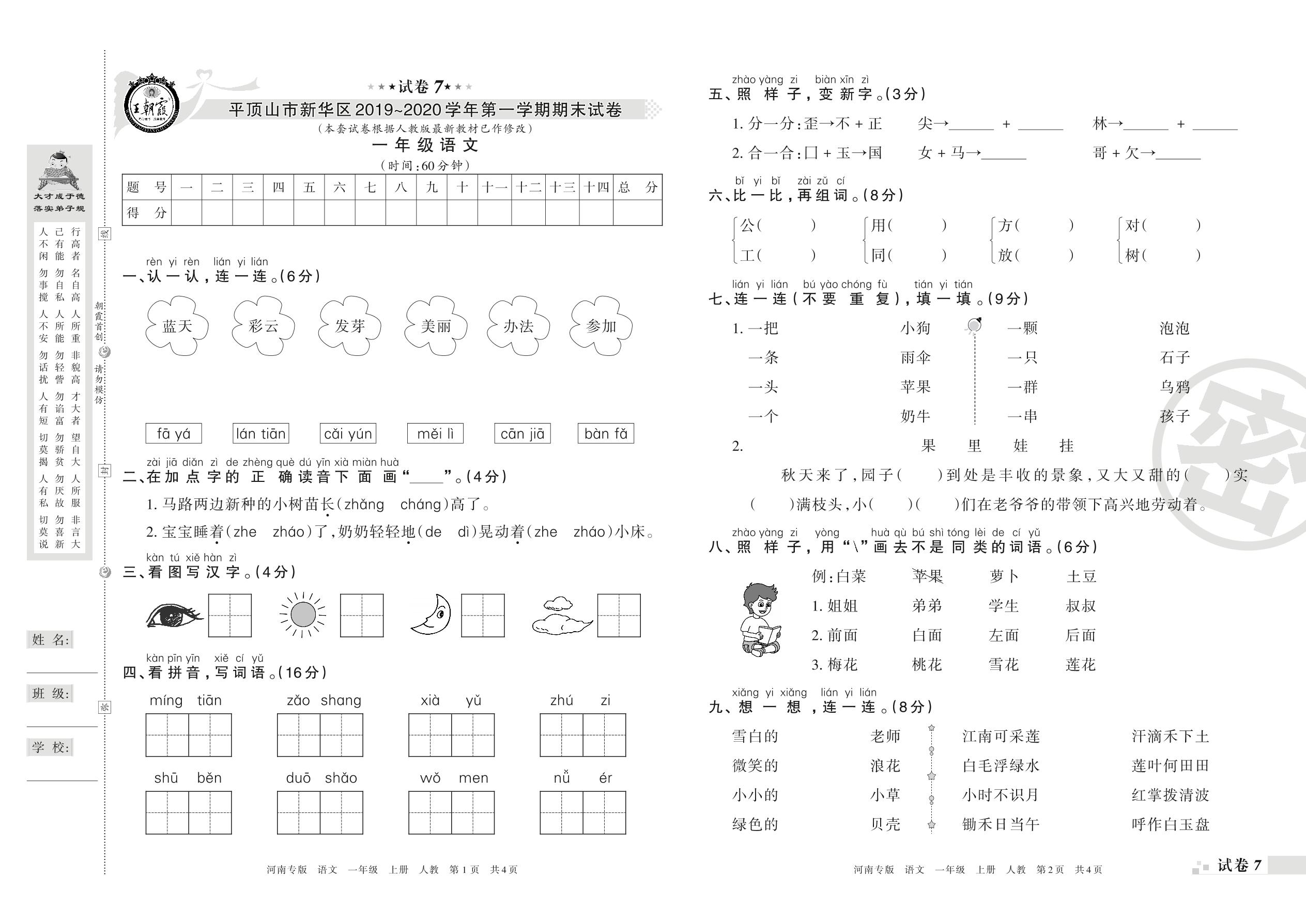 2019-2020学年第一学期平顶山市新华区一年级语文试卷(人教版)【7】