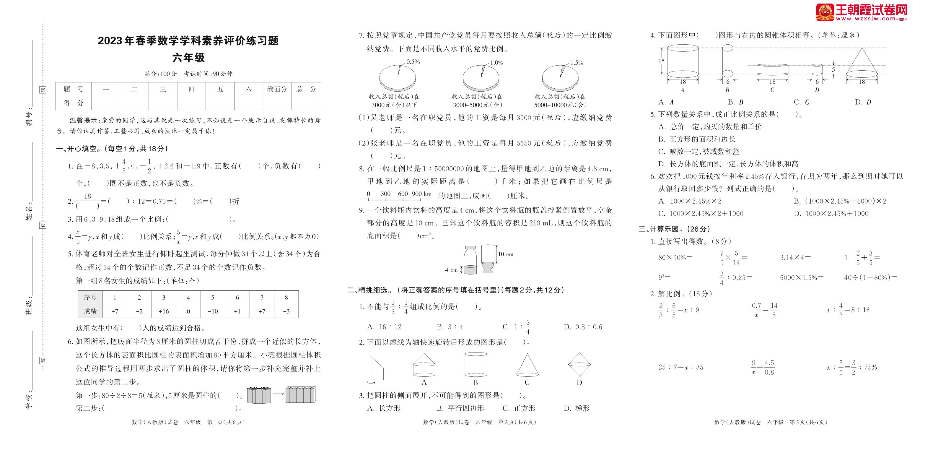 河南省郑州市中牟县2022—2023学年下学期期中学科素养评价试题六年级数学(人教版)