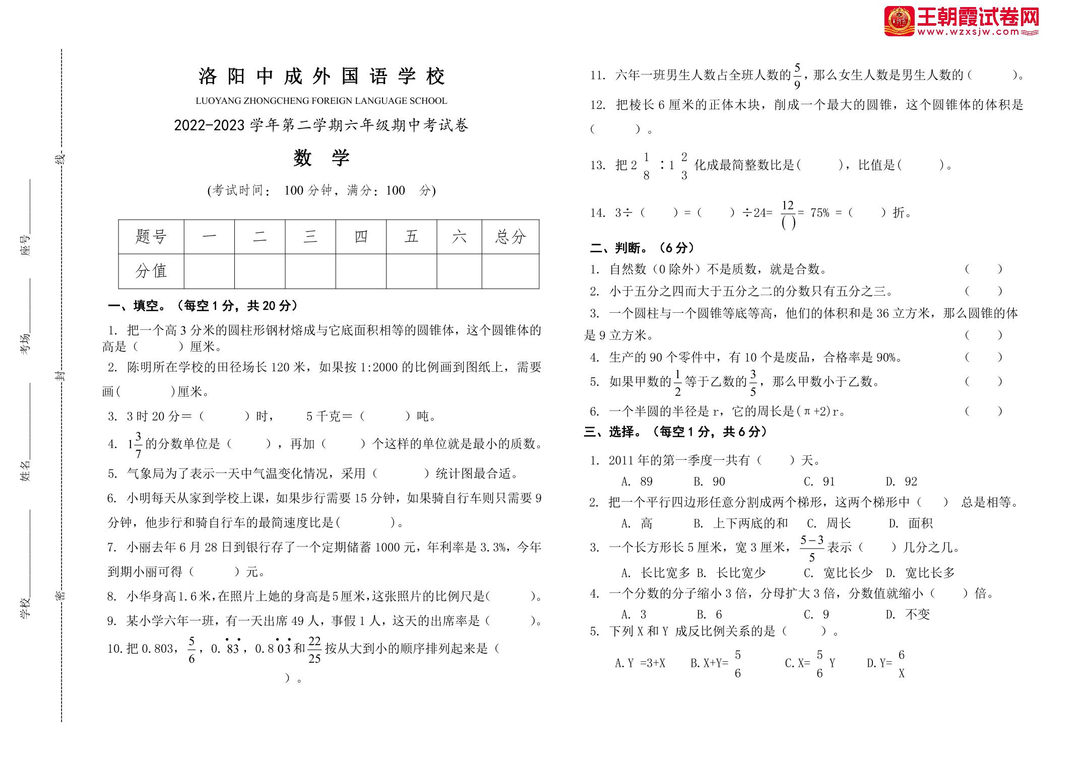 河南省洛阳偃师中成外国语学校2022—2023学年下学期期中考试试题六年级数学(苏教版)