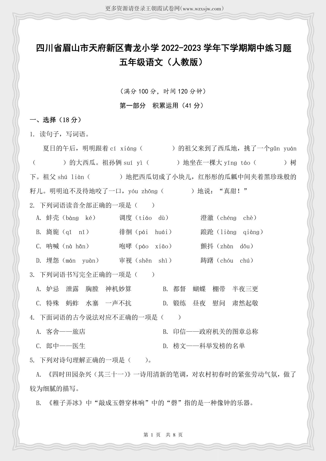 四川省眉山市天府新区青龙小学2022-2023学年下学期期中练习五年级语文(人教版)