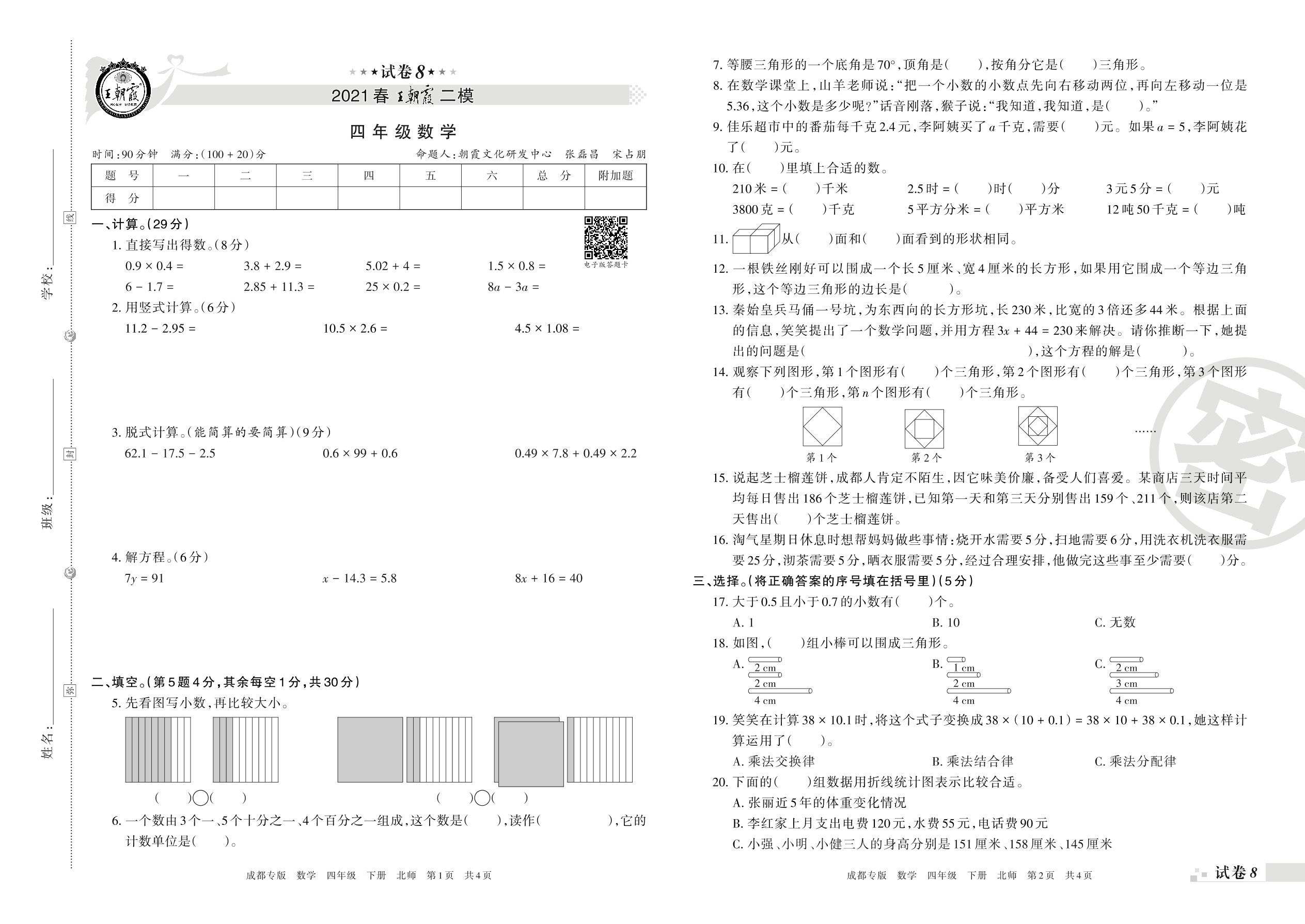 王朝霞期末模拟卷四年级下册数学(北师版)_R210804134228【8】
