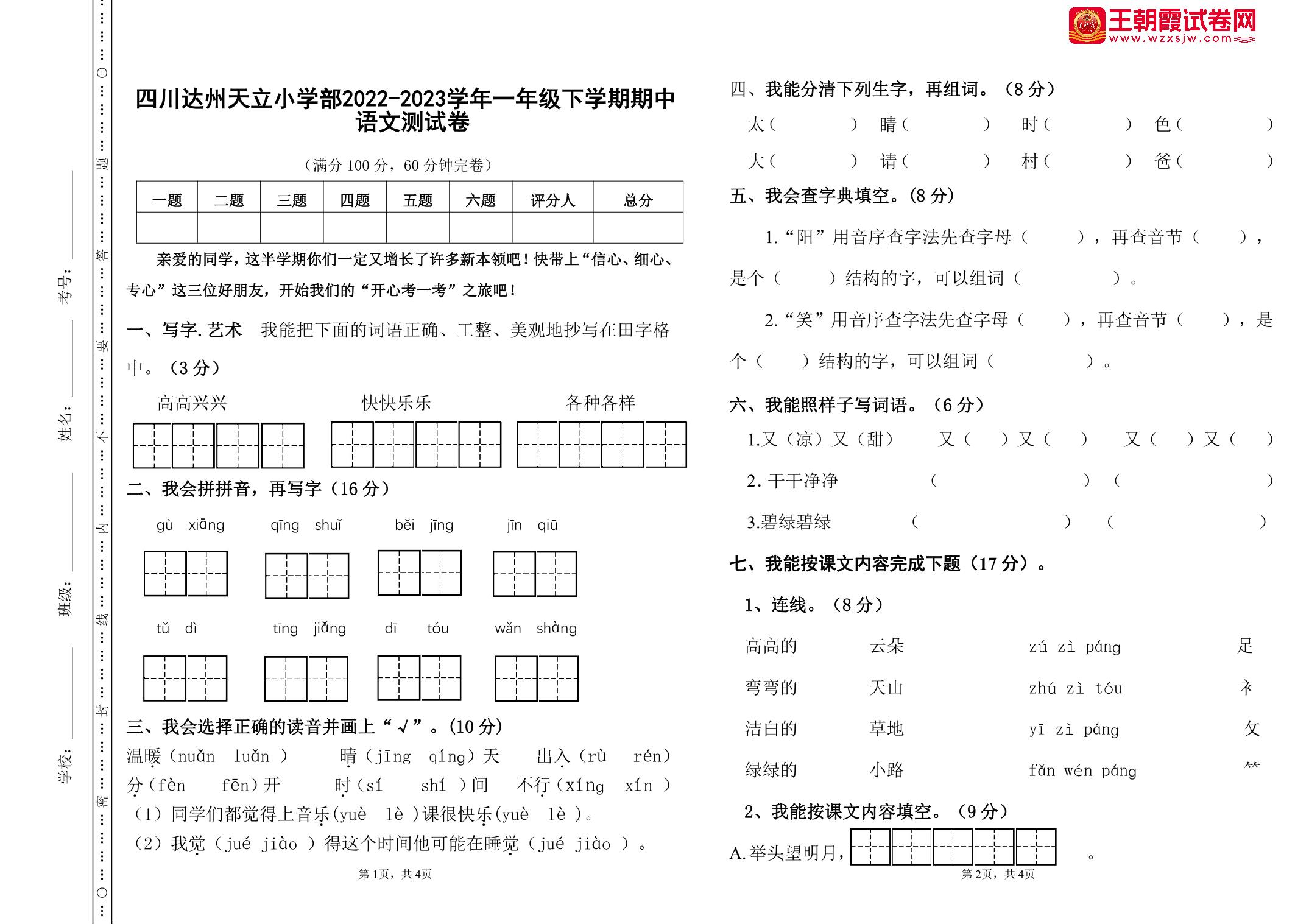 四川省达州市天立小学2022-2023学年下学期期中测试一年级语文(人教版)