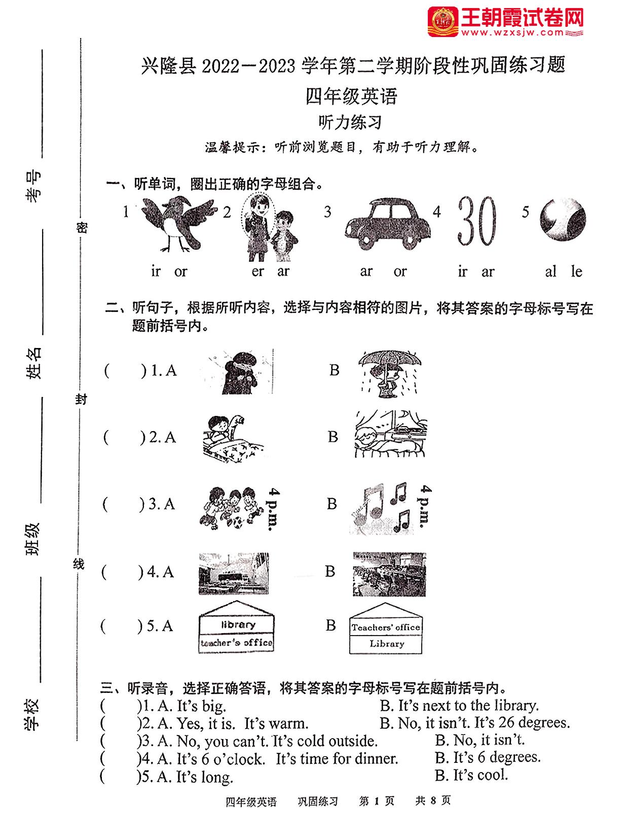 河北省承德市兴隆县2022-2023学年度第二学期阶段性巩固练习期中试卷四年级英语(人教PEP版)