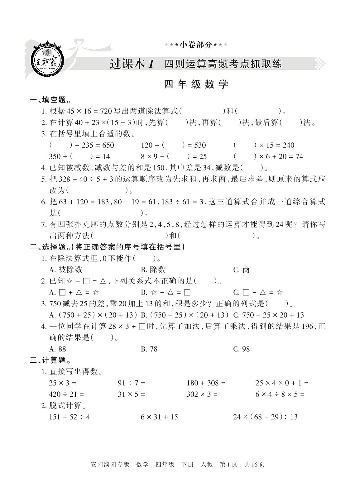 王朝霞期末小卷四年级下册数学(人教版)_R210804134237【0】