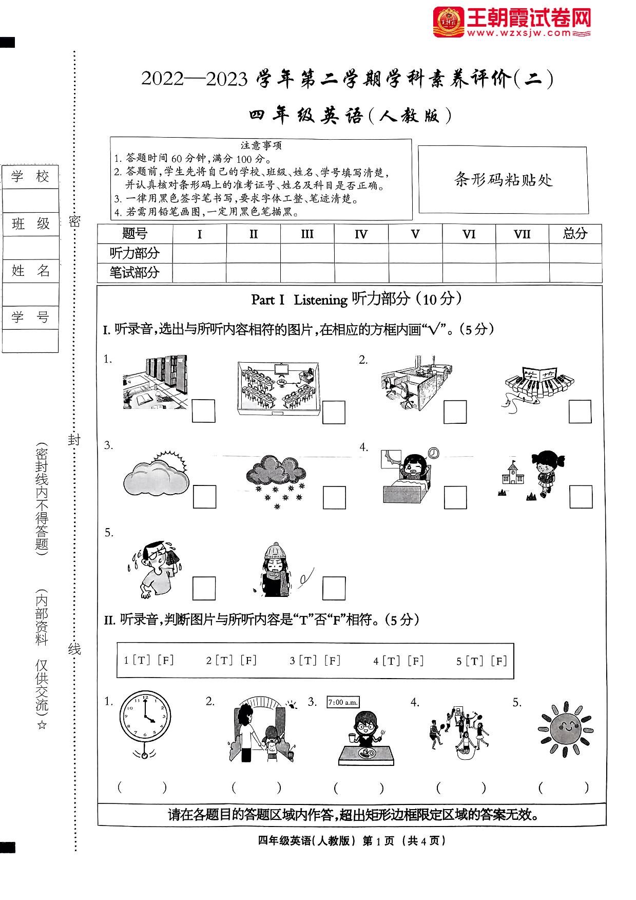 四年级英语人教PEP版(三起始)下册期中卷