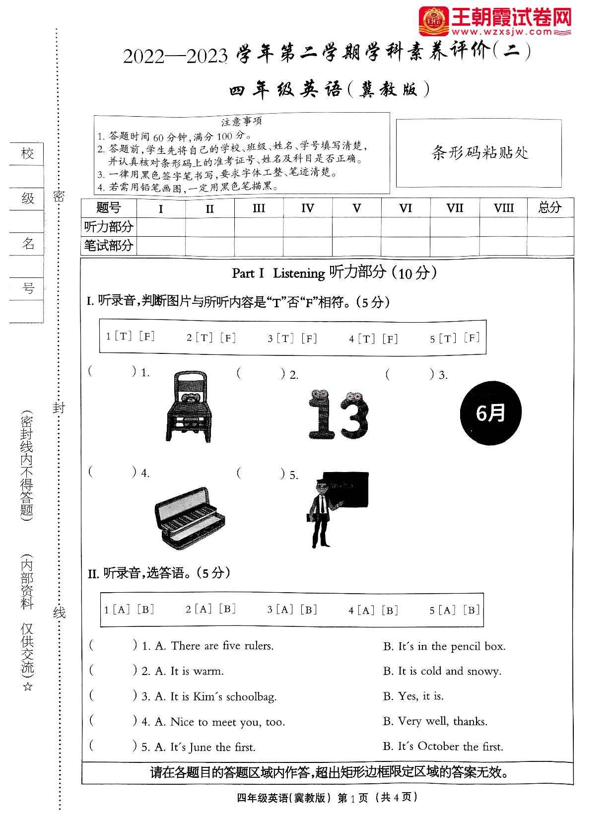 四年级英语冀教版下册期中卷